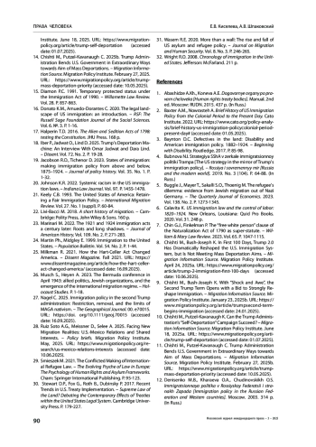 РЕЗУЛЬТАТЫ ИССЛЕДОВАНИЯ. По итогам проведенного исследования сделан вывод, что миграционная политика и законодательство США прошли в своем развитии ряд этапов, в ходе которых отношение к иммигрантам изменялось в диапазоне от поощрения миграции до введения жестких ограничений. Сформированные на сегодняшний день международно-правовые основы в сфере миграции и вынужденного перемещения не в полной мере связывают США по причине участия государства в малом числе применимых международных договоров, а действующие для США обязательства не в полной мере выполняются.