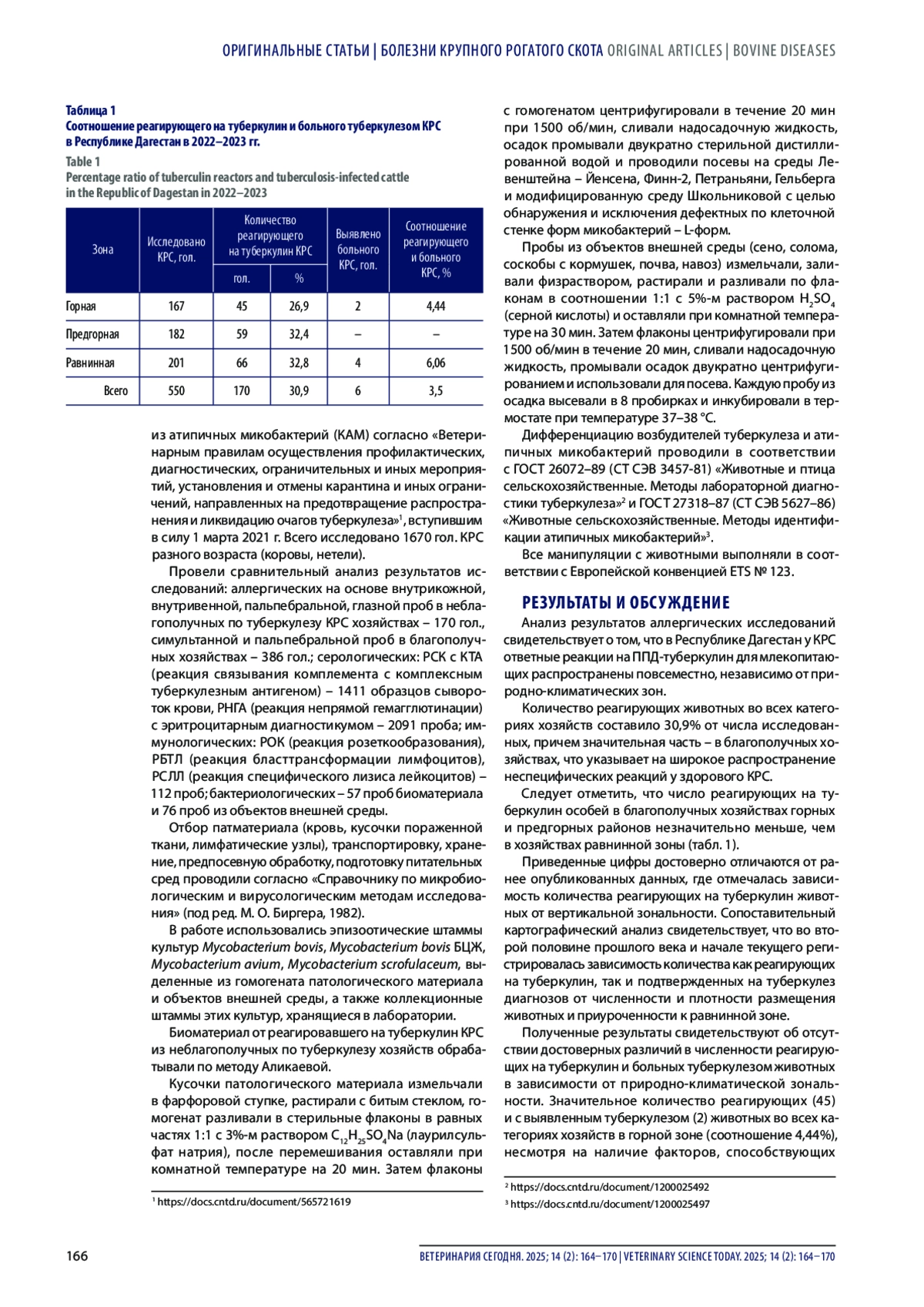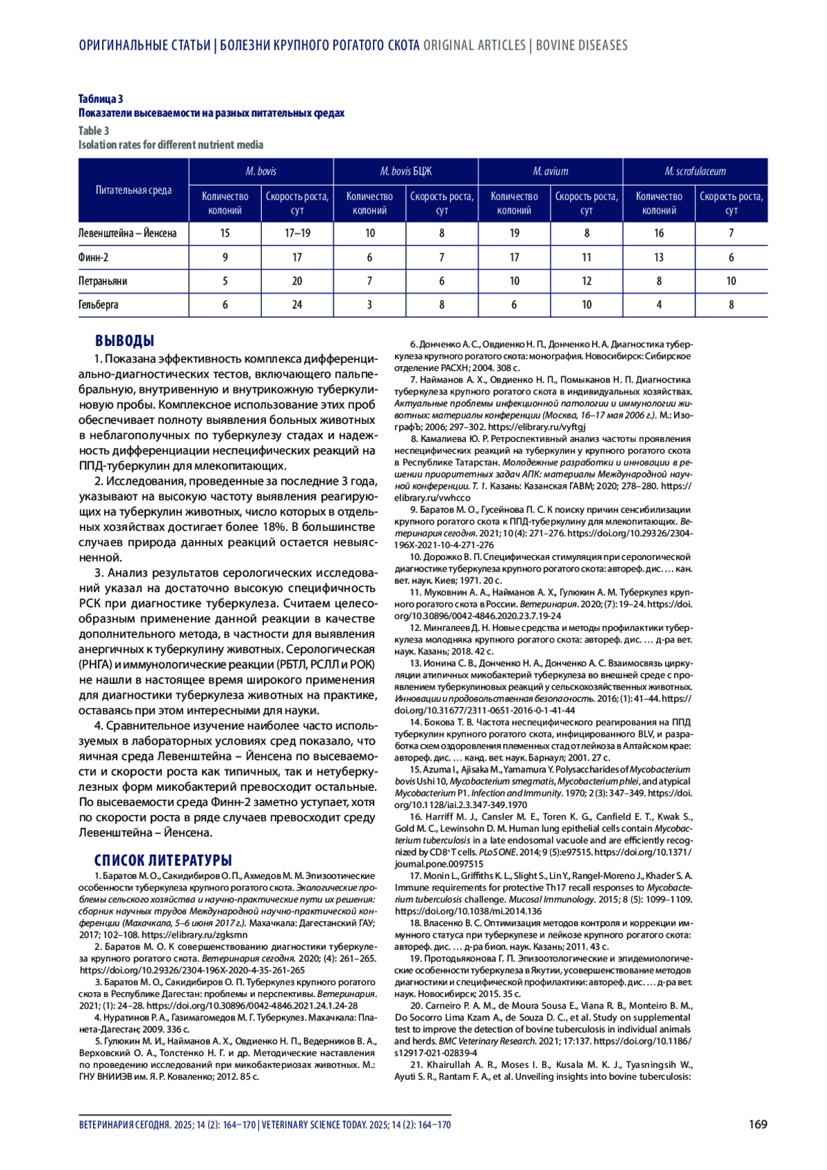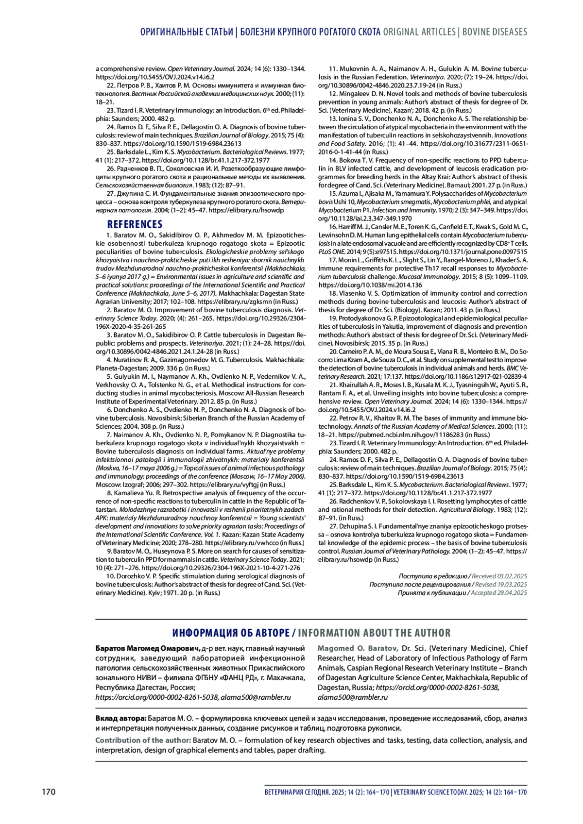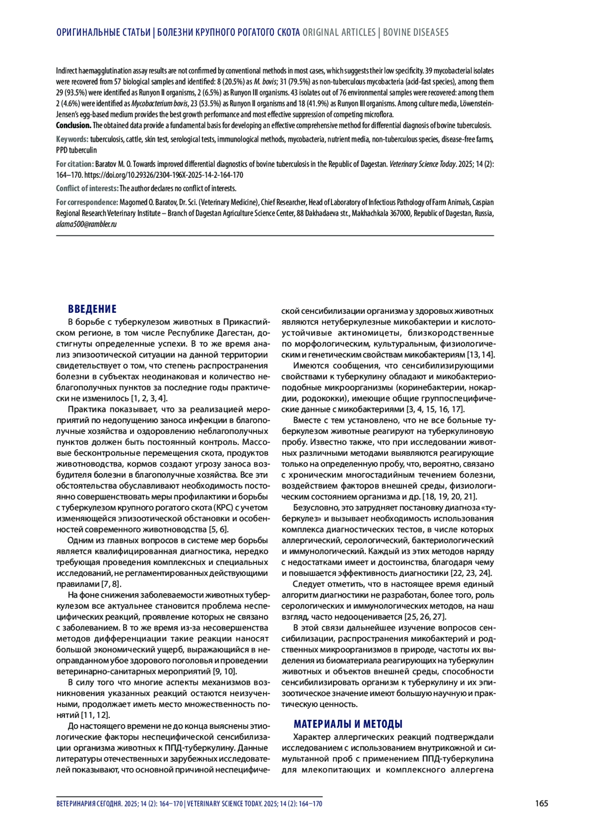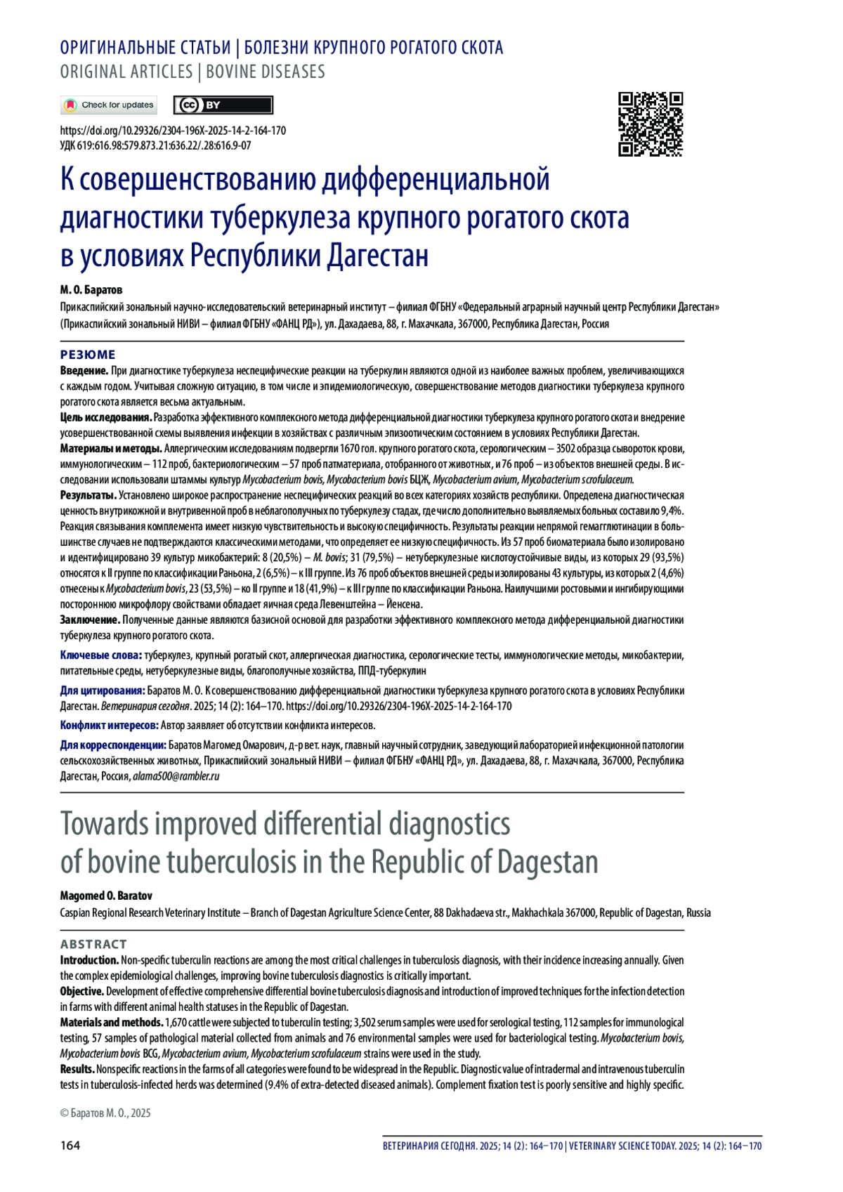 БАРАТОВ М. О. К СОВЕРШЕНСТВОВАНИЮ ДИФФЕРЕНЦИАЛЬНОЙ ДИАГНОСТИКИ ТУБЕРКУЛЕЗА КРУПНОГО РОГАТОГО СКОТА В УСЛОВИЯХ РЕСПУБЛИКИ ДАГЕСТАН // ВЕТЕРИНАРИЯ СЕГОДНЯ. 2025. № 2, ТОМ 14
