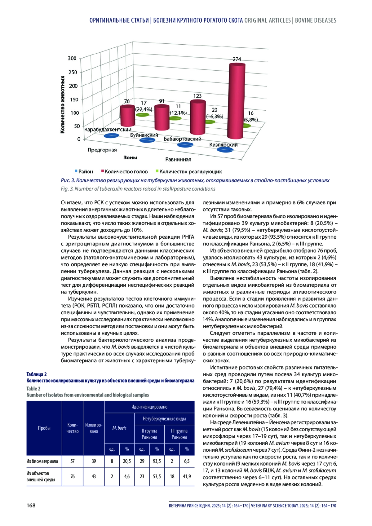 Результаты. Установлено широкое распространение неспецифических реакций во всех категориях хозяйств республики. Определена диагностическая ценность внутрикожной и внутривенной проб в неблагополучных по туберкулезу стадах, где число дополнительно выявляемых больных составило 9,4%. Реакция связывания комплемента имеет низкую чувствительность и высокую специфичность. Результаты реакции непрямой гемагглютинации в большинстве случаев не подтверждаются классическими методами, что определяет ее низкую специфичность. Из 57 проб биоматериала было изолировано и идентифицировано 39 культур микобактерий: 8 (20,5%) – M. bovis; 31 (79,5%) – нетуберкулезные кислотоустойчивые виды, из которых 29 (93,5%) относятся к II группе по классификации Раньона, 2 (6,5%) – к III группе. Из 76 проб объектов внешней среды изолированы 43 культуры, из которых 2 (4,6%) отнесены к Mycobacterium bovis, 23 (53,5%) – ко II группе и 18 (41,9%) – к III группе по классификации Раньона. Наилучшими ростовыми и ингибирующими постороннюю микрофлору свойствами обладает яичная среда Левенштейна – Йенсена.