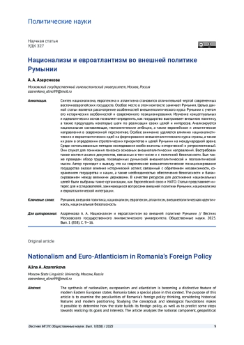 Синтез национализма, европеизма и атлантизма становится отличительной чертой современных восточноевропейских государств. Особое место в этом контексте занимает Румыния. Целью данной статьи является рассмотрение особенностей внешнеполитического курса Румынии с учетом его исторических особенностей и современного позиционирования. Изучение концептуальных и идеологических основ позволяет определить, как государство выстраивает внешнюю политику, а также предугадать некоторые шаги по реализации своих целей и интересов. Анализируется национальная составляющая, геополитические амбиции, а также европейское и атлантическое направления в современной перспективе. Особое внимание уделяется влиянию националистических и евроатлантических идей на формирование внешнеполитического курса страны, а также их роли в определении стратегических приоритетов и целей Румынии на международной арене. Среди использованных методов исследования особо значимы исторический и ретроспективный. Они служат для понимания генезиса основных внешнеполитических направлений. Востребован также контент-анализ документов, связанных в том числе и с политикой безопасности. Был также проведен обзор трудов, посвященных румынской внешнеполитической и геополитической мысли. Автор приходит к выводу, что на современное внешнеполитическое позиционирование государства оказал влияние исторический аспект, связанный с обретением независимости, сохранением государства и нации, а также необходимостью обеспечения безопасности и балансированием между великими державами.