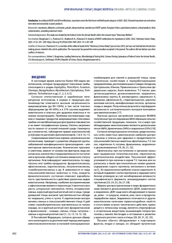 Заключение. Согласно отчетам RASFF и ACN за 2020–2022 гг., микотоксины представляли третью по распространенности категорию опасности. Нарушение законодательства в части превышения предельно допустимых концентраций микотоксинов выявлено исключительно в продукции растительного происхождения.