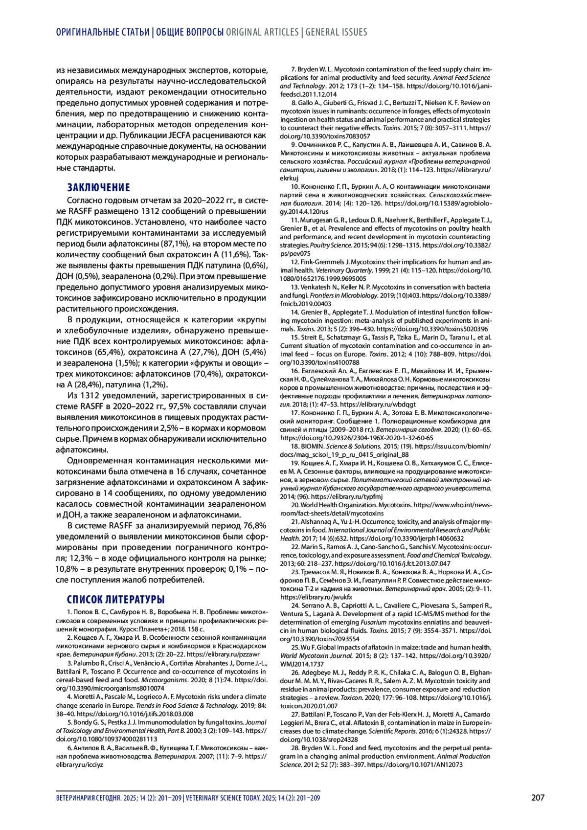 2. Кощаев А. Г., Хмара И. В. Особенности сезонной контаминации микотоксинами зернового сырья и комбикормов в Краснодарском крае. Ветеринария Кубани. 2013; (2): 20-22.