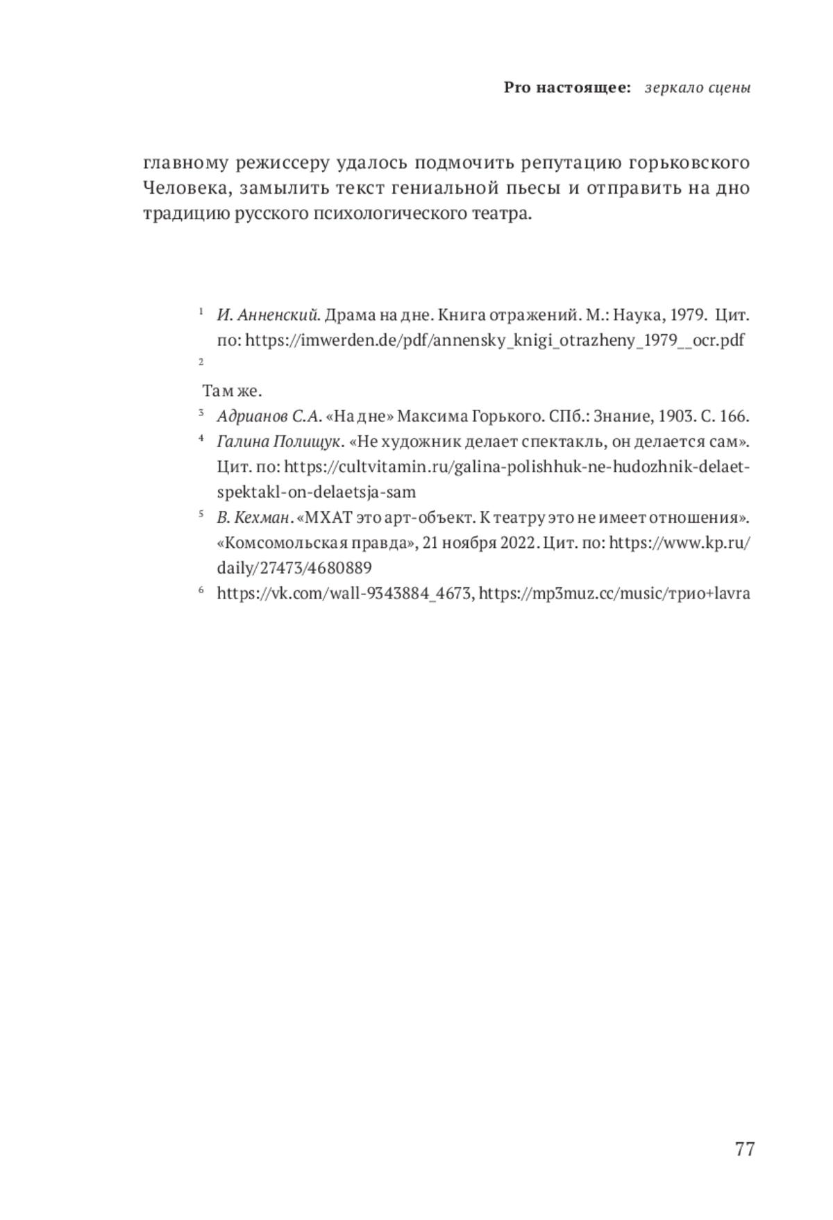4. В. Кехман. “МХАТ это арт-объект. К театру это не имеет отношения”. “Комсомольская правда”, 21 ноября 2022. Цит. по: https://www.kp.ru/daily/27473/4680889.