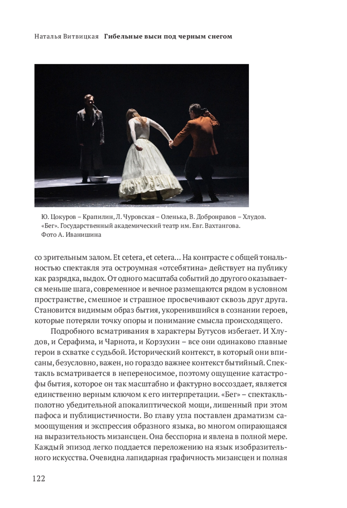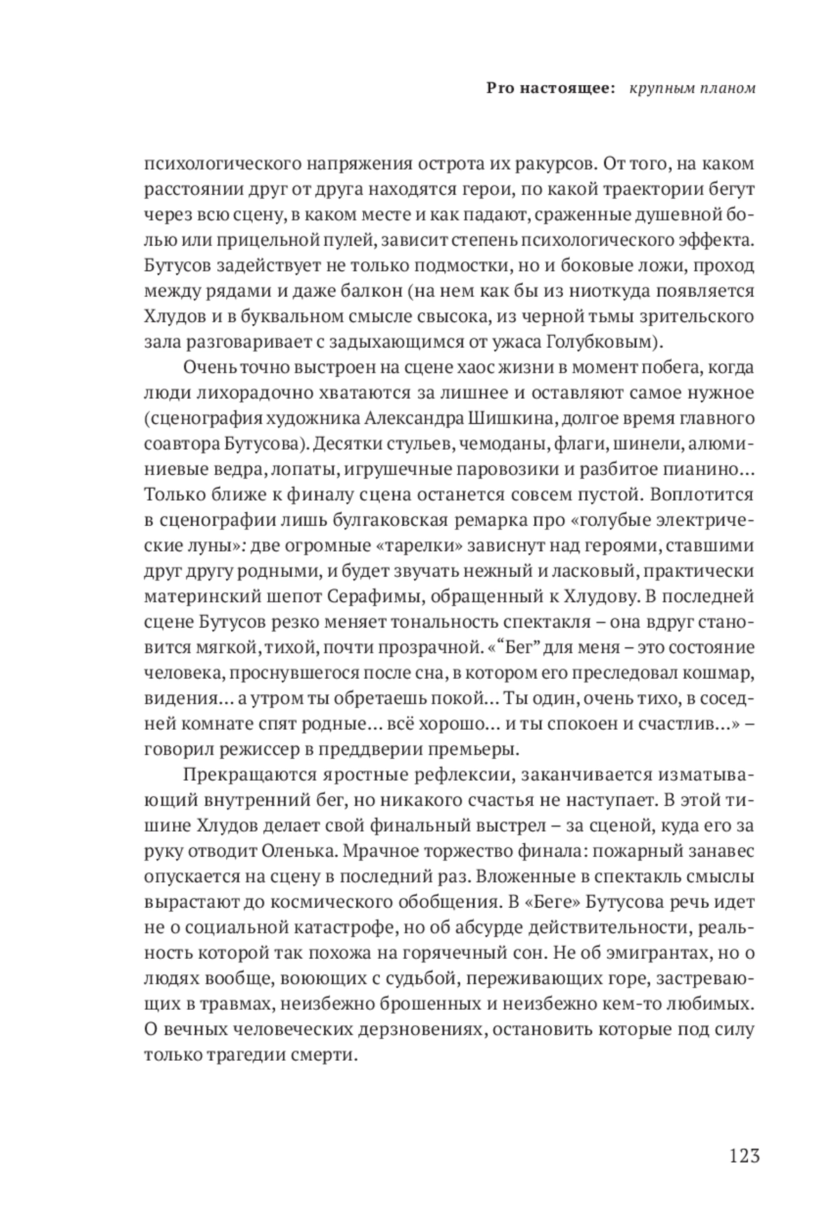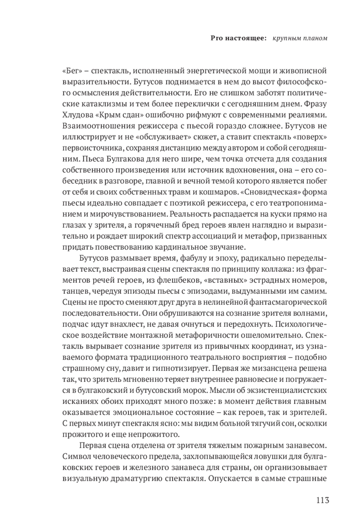 «Бег» – спектакль, исполненный энергетической мощи и живописной выразительности. Бутусов поднимается в нем до высот философского осмысления действительности. Его не слишком заботят политические катаклизмы и тем более переклички с сегодняшним днем. Фразу Хлудова «Крым сдан» ошибочно рифмуют с современными реалиями. Взаимоотношения режиссера с пьесой гораздо сложнее. Бутусов не иллюстрирует и не «обслуживает» сюжет, а ставит спектакль «поверх» первоисточника, сохраняя дистанцию между автором и собой сегодняшним. Пьеса Булгакова для него шире, чем точка отсчета для создания собственного произведения или источник вдохновения, она – его собеседник в разговоре, главной и вечной темой которого является побег от себя и своих собственных травм и кошмаров. «Сновидческая» форма пьесы идеально совпадает с поэтикой режиссера, с его театропониманием и мирочувствованием. Реальность распадается на куски прямо на глазах у зрителя, а горячечный бред героев явлен наглядно и выразительно и рождает широкий спектр ассоциаций и метафор, призванных придать повествованию кардинальное звучание.