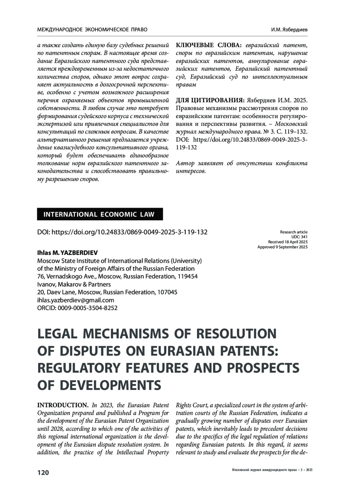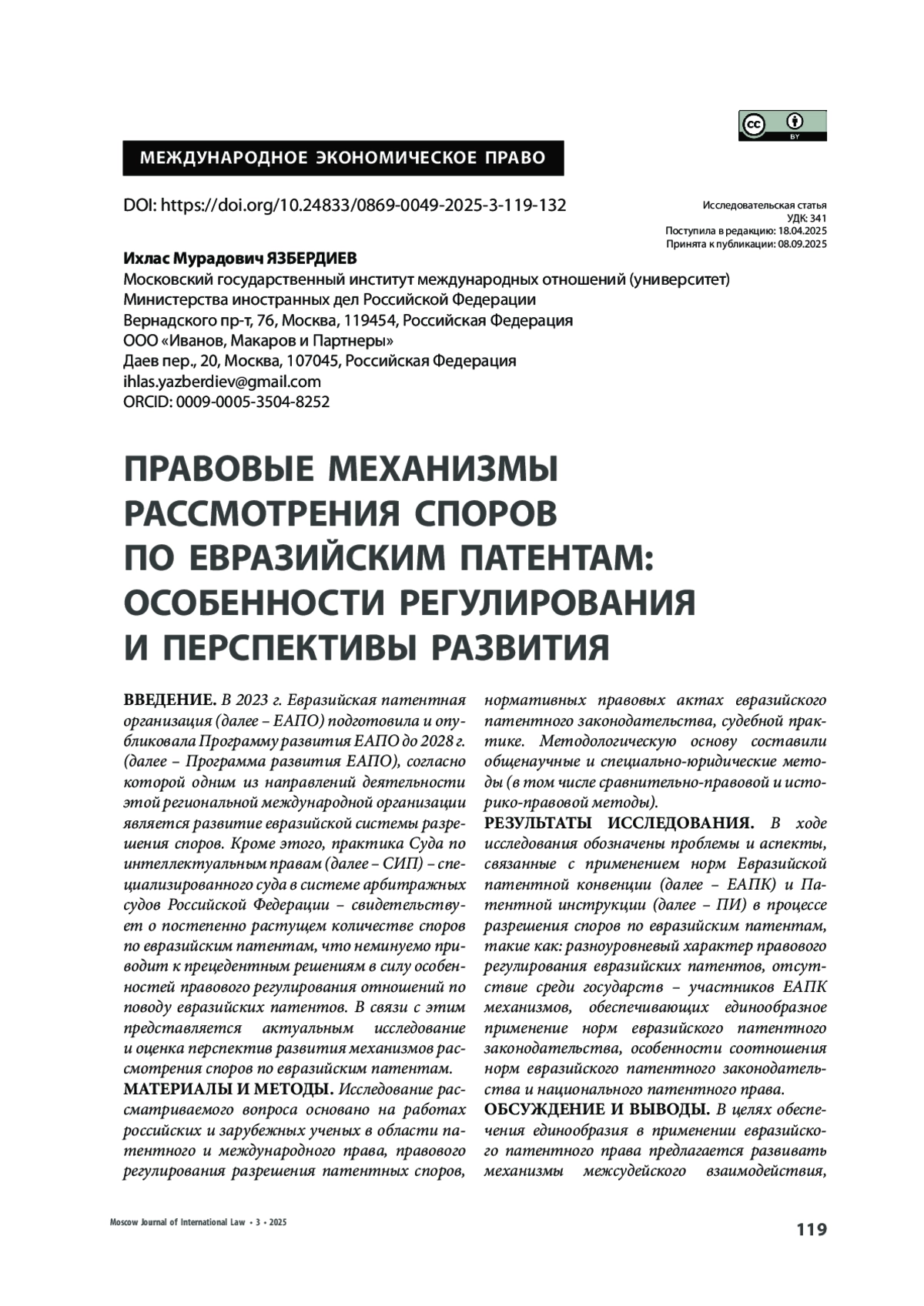 ВВЕДЕНИЕ. В 2023 г. Евразийская патентная организация (далее – ЕАПО) подготовила и опубликовала Программу развития ЕАПО до 2028 г. (далее – Программа развития ЕАПО), согласно которой одним из направлений деятельности этой региональной международной организации является развитие евразийской системы разрешения споров. Кроме этого, практика Суда по интеллектуальным правам (далее – СИП) – специализированного суда в системе арбитражных судов Российской Федерации – свидетельствует о постепенно растущем количестве споров по евразийским патентам, что неминуемо приводит к прецедентным решениям в силу особенностей правового регулирования отношений по поводу евразийских патентов. В связи с этим представляется актуальным исследование и оценка перспектив развития механизмов рассмотрения споров по евразийским патентам.