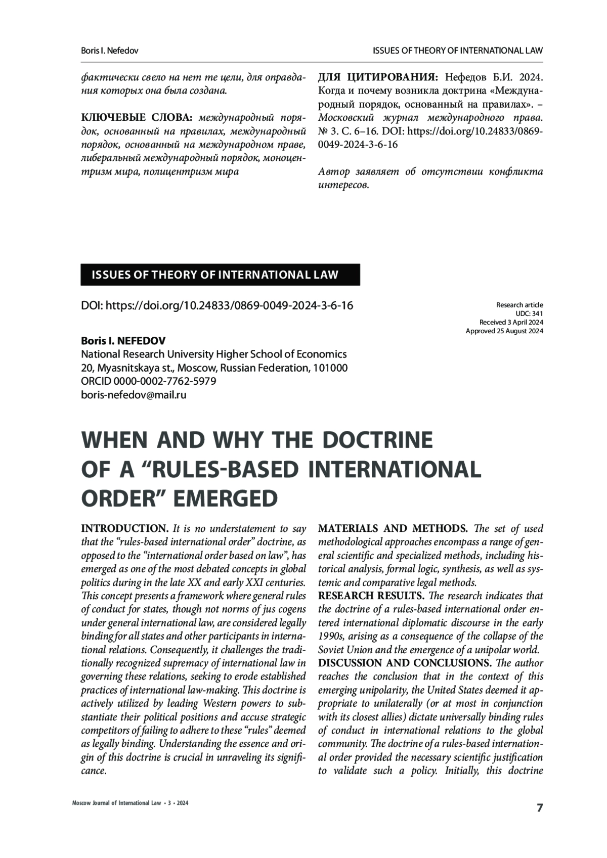 7. Нефедов Б.И. 2021. Понятие «правила» в доктрине «международного порядка, основанного на правилах». - Россия и современный мир. № 3. С. 6-21.