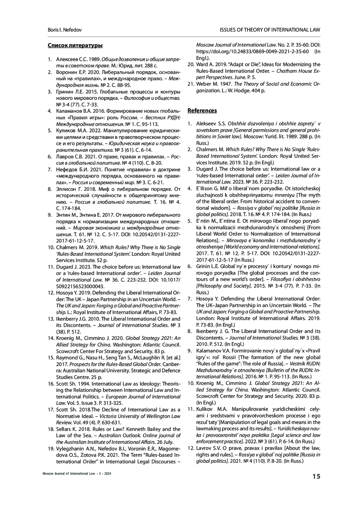 19. Vylegzhanin A.N., Nefedov B.I., Voronin E.R., Magomedova O.S., Zotova P.K. 2021. The Term “Rules-based International Order” in International Legal Discourses - Moscow Journal of International Law. No. 2. P. 35-60. https://doi.org/10.24833/0869-0049-2021-2-35-60 (In Engl.).