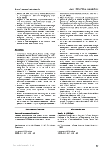 3. Цветкова Ю.В. 2017. Механизм расширения Европейского союза на современном этапе. - Научные труды Северо-Западного института управления РАНХиГС. № 2 (29). Т. 8. С. 181-190.