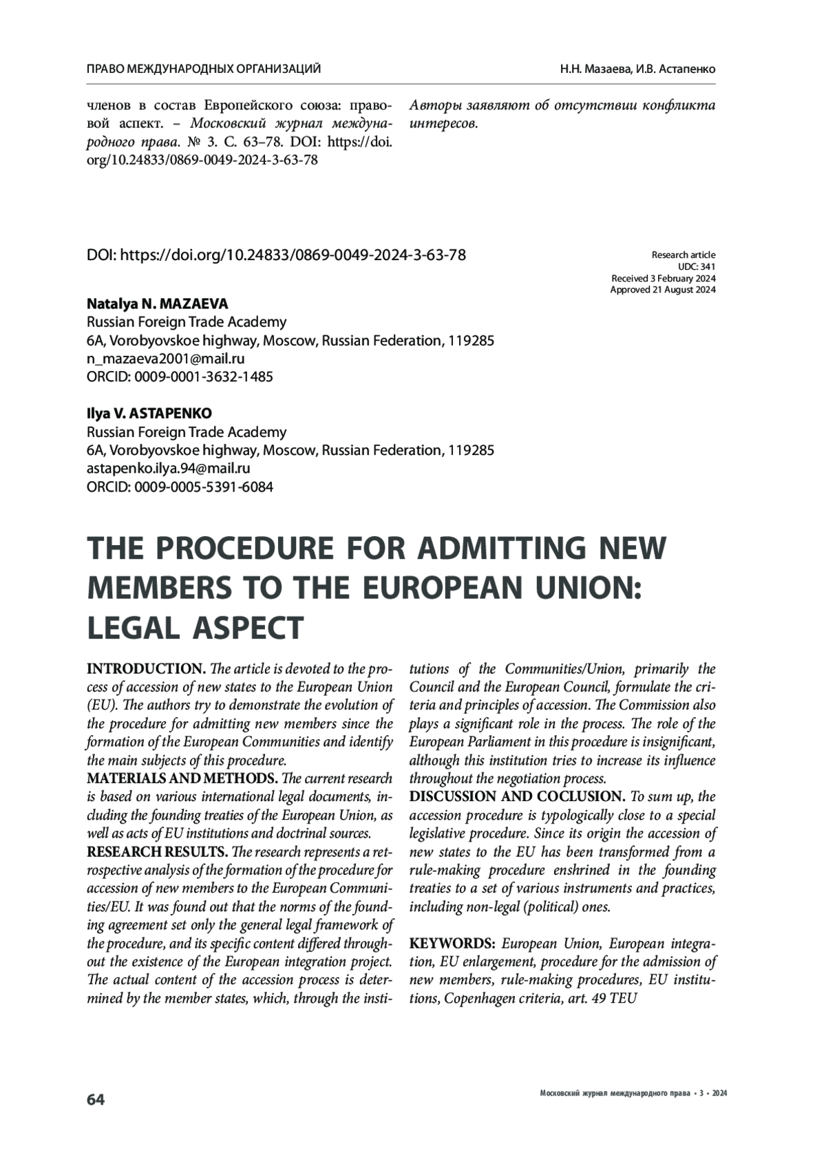 РЕЗУЛЬТАТЫ ИССЛЕДОВАНИЯ. В ходе исследования был проведен ретроспективный анализ формирования процедуры присоединения новых членов к Сообществам, а затем к ЕС. Сделан вывод о том, что нормы учредительного договора задают лишь общую правовую рамку процедуры, а ее конкретное наполнение отличалось на всем протяжении существования европейского интеграционного проекта. Реальное содержание процесса присоединения определяется государствами-членами, которые через институты Сообществ/Союза (в первую очередь Совет ЕС и Европейский совет) формируют критерии и принципы присоединения. Значительную роль в процессе оценки соответствия государств-кандидатов установленным критериям играет Европейская комиссия (Комиссия). Роль Европейского парламента (Парламент) в указанной процедуре незначительная, хотя данный институт и пытается увеличить свое влияние, в том числе на ход переговорного процесса.