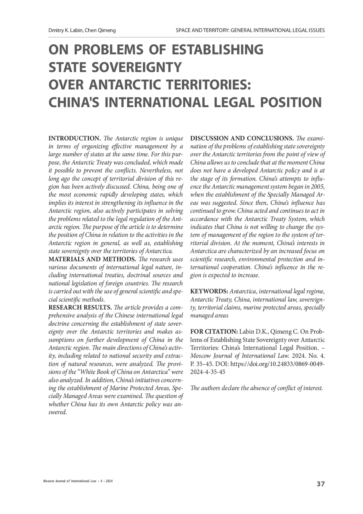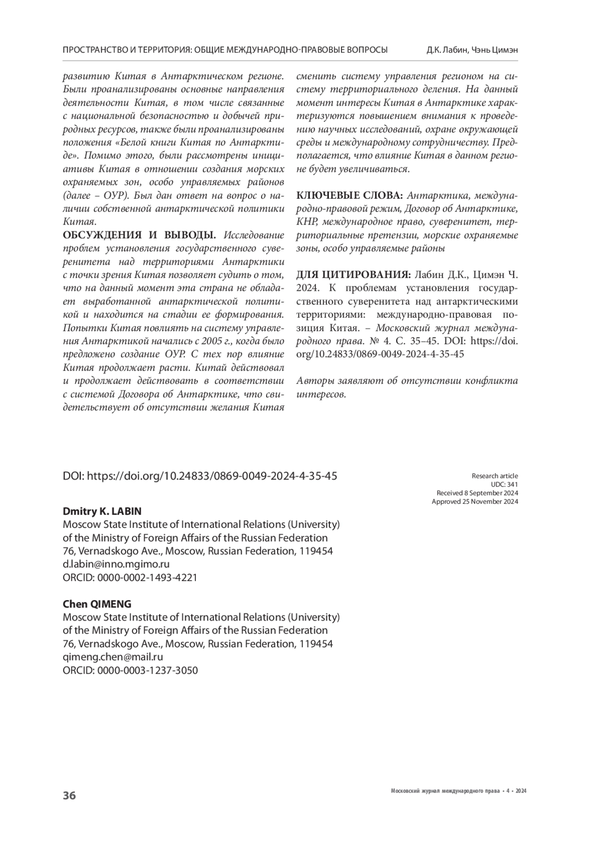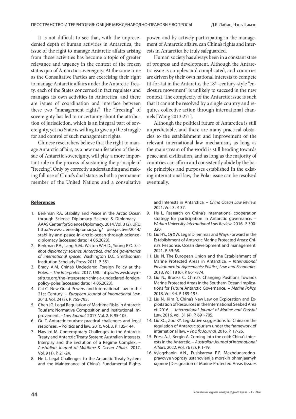 ЛАБИН Д. К., ЧЭНЬ Ц. К ПРОБЛЕМАМ УСТАНОВЛЕНИЯ ГОСУДАРСТВЕННОГО СУВЕРЕНИТЕТА НАД АНТАРКТИЧЕСКИМИ ТЕРРИТОРИЯМИ: МЕЖДУНАРОДНО-ПРАВОВАЯ ПОЗИЦИЯ КИТАЯ // МОСКОВСКИЙ ЖУРНАЛ МЕЖДУНАРОДНОГО ПРАВА. 2024. ВЫПУСК 4