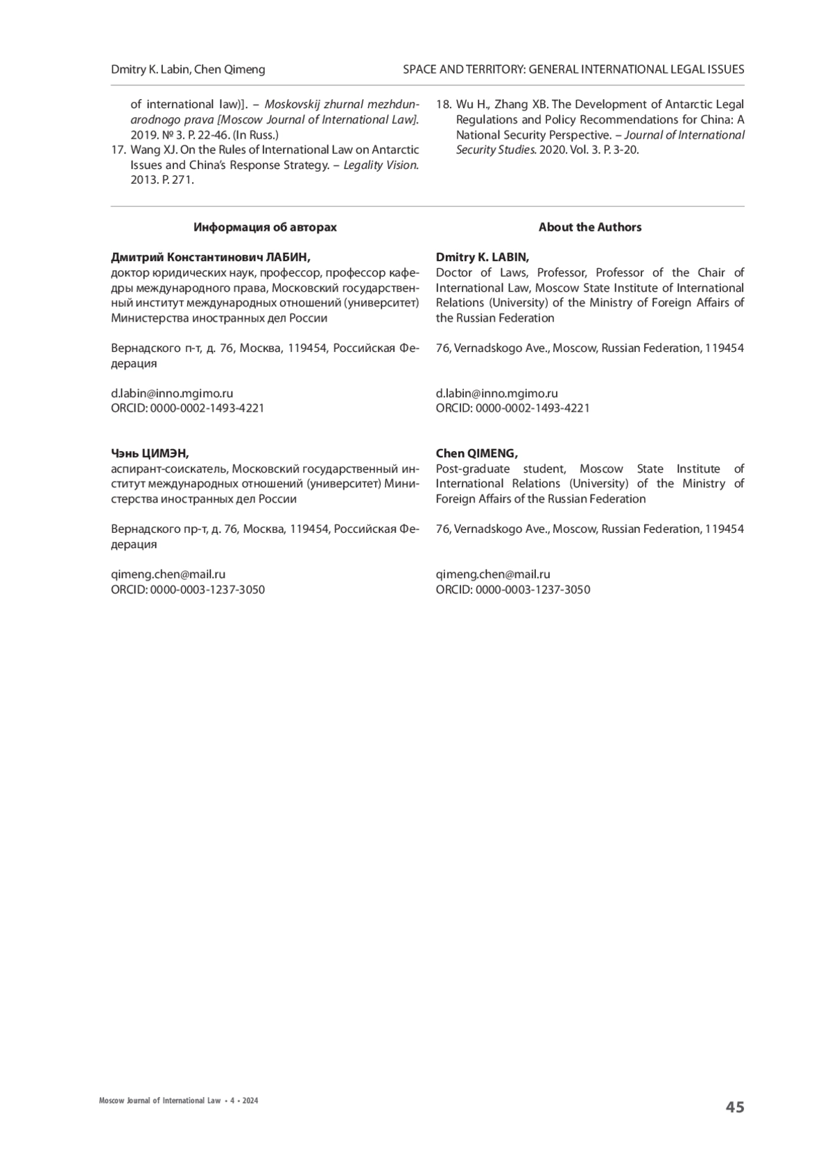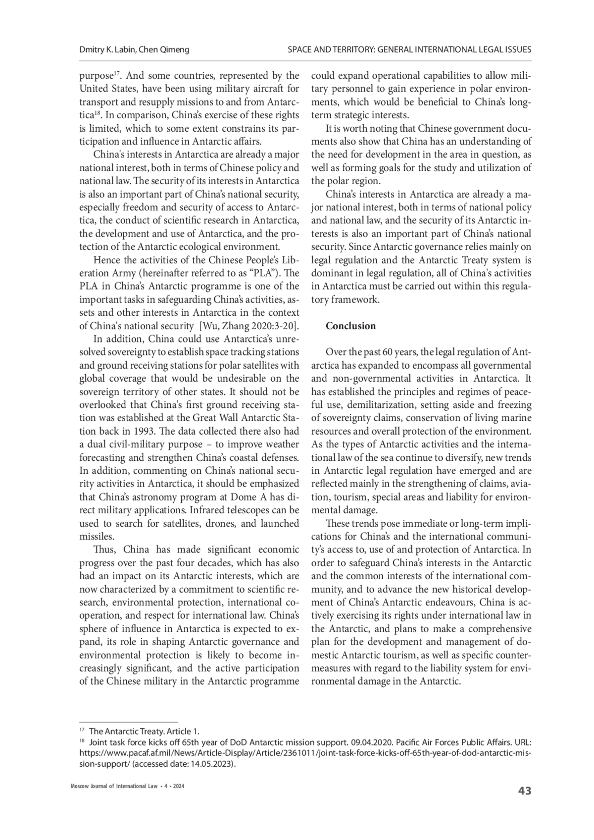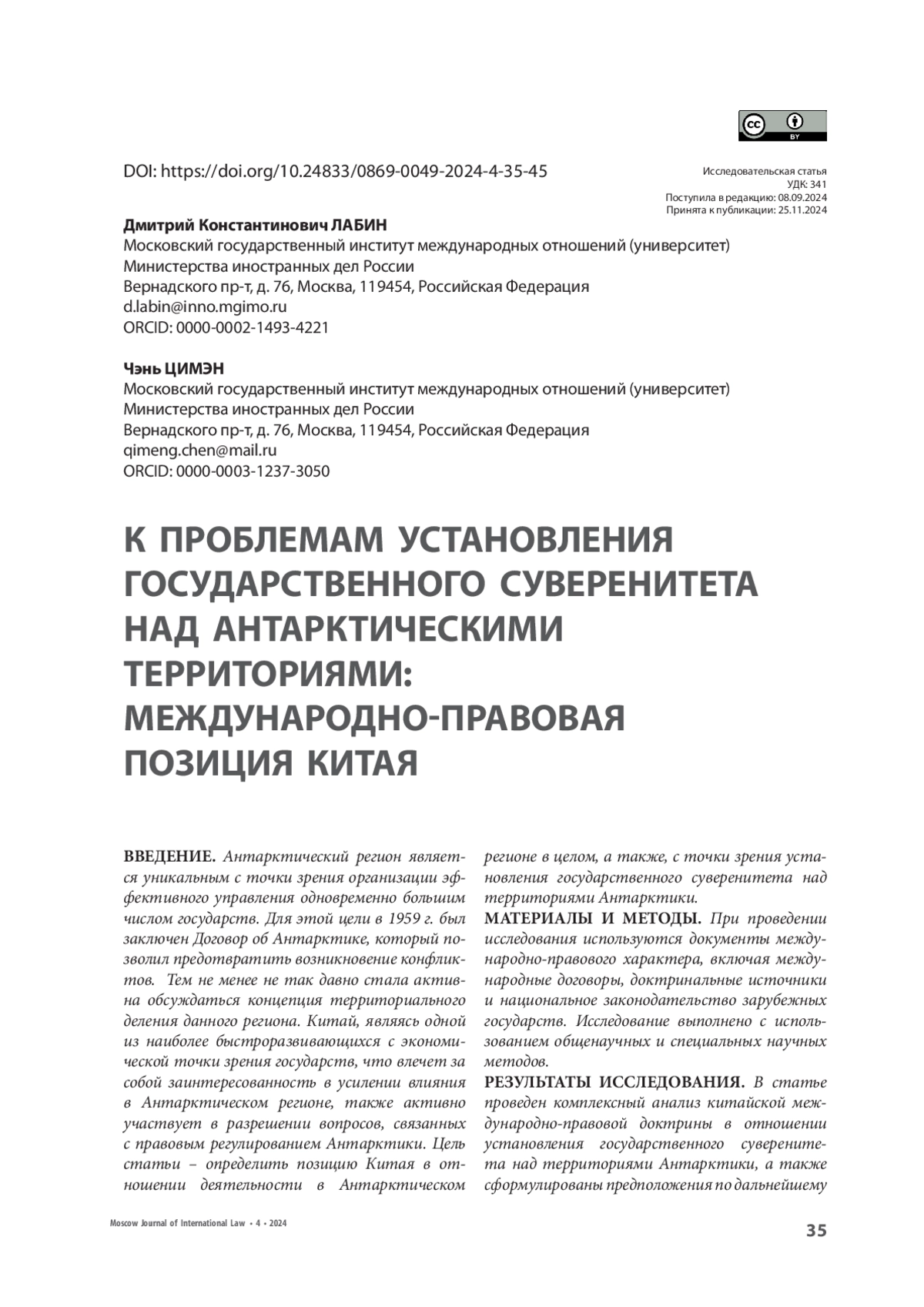 ЛАБИН Д. К., ЧЭНЬ Ц. К ПРОБЛЕМАМ УСТАНОВЛЕНИЯ ГОСУДАРСТВЕННОГО СУВЕРЕНИТЕТА НАД АНТАРКТИЧЕСКИМИ ТЕРРИТОРИЯМИ: МЕЖДУНАРОДНО-ПРАВОВАЯ ПОЗИЦИЯ КИТАЯ // МОСКОВСКИЙ ЖУРНАЛ МЕЖДУНАРОДНОГО ПРАВА. 2024. ВЫПУСК 4
