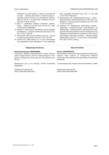19. Nicholas T. 2012. Cyber-attacks, self-defense and the problem of attribution. - Journal of conflict and security law. Vol. 17. № 2. Р. 229-244.