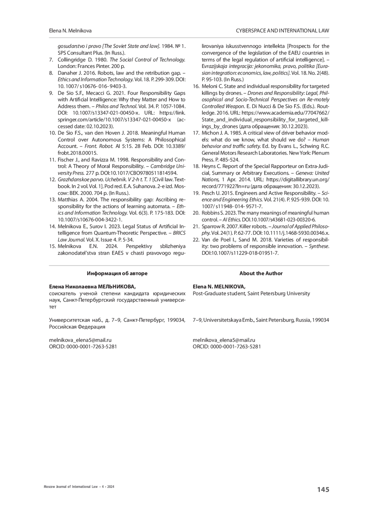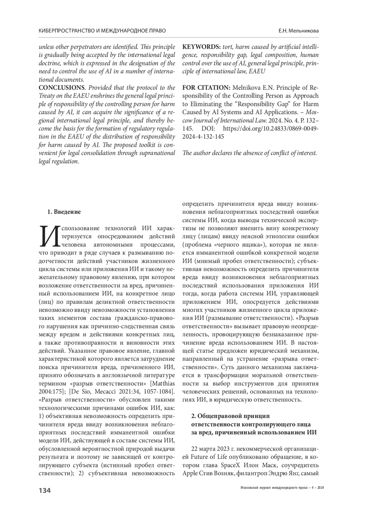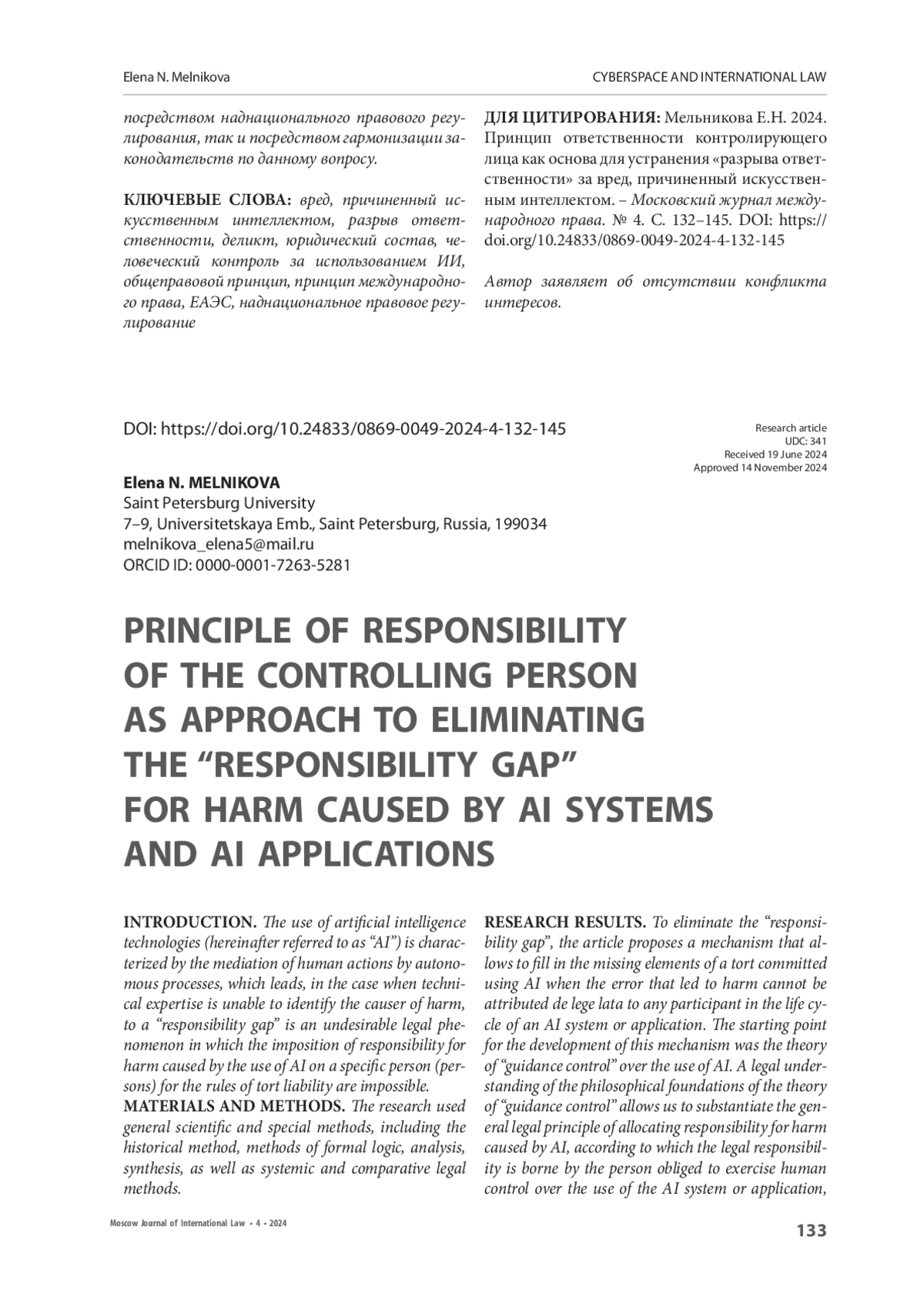 МЕЛЬНИКОВА Е. Н. ПРИНЦИП ОТВЕТСТВЕННОСТИ КОНТРОЛИРУЮЩЕГО ЛИЦА КАК ОСНОВА ДЛЯ УСТРАНЕНИЯ «РАЗРЫВА ОТВЕТСТВЕННОСТИ» ЗА ВРЕД, ПРИЧИНЕННЫЙ ИСКУССТВЕННЫМ ИНТЕЛЛЕКТОМ // МОСКОВСКИЙ ЖУРНАЛ МЕЖДУНАРОДНОГО ПРАВА. 2024. ВЫПУСК 4