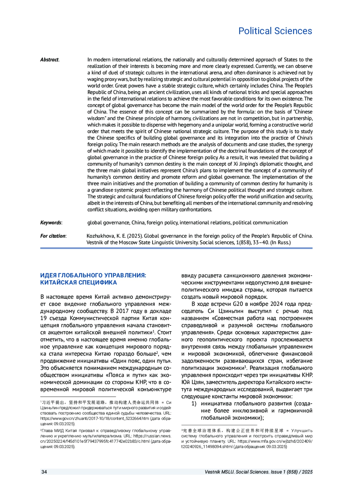 В современных международных отношениях все более четко выражается национально и культурно детерминированный подход государств к реализации своих интересов. В настоящее время на международной арене наблюдается своеобразный поединок стратегических культур, и часто доминация достигается не путем ведения прокси-войн, а реализацией стратегико-культурного потенциала в противостоянии глобальных проектов мирового порядка. Устойчивой стратегической культурой обладают великие державы, к которым безусловно относится и Китай. Китайская Народная Республика, будучи древней цивилизацией, использует в сфере международных отношений всевозможные национальные хитрости и особые подходы для достижения наиболее выгодных условий собственного существования. Основной моделью мирового порядка для Китайской Народной Республики стала концепция глобального управления. Сущность данной концепции можно резюмировать формулой: на базе «китайской мудрости» и китайского принципа гармонии цивилизации находятся не в конкуренции, а в партнерских отношениях, что позволяет обходиться без гегемонии и однополярного мира, формируя конструктивный миропорядок, отвечающий духу китайской национальной стратегической культуры. Цель данного исследования - изучить китайскую специфику построения глобального управления и ее интеграции в практику внешнеполитического курса КНР. Основными методами исследования являются анализ документов и кейс-стади, синергия которых позволяет выявить реализацию доктринальных оснований концепции глобального управления в практике китайской внешней политики. В результате было установлено, что построение сообщества единой судьбы человечества является основной концепцией дипломатической мысли Си Цзиньпина, а три основные глобальные инициативы представляют собой планы Китая по реализации концепции сообщества единой судьбы человечества и содействию реформированию и построению глобального управления. Реализация трех основных инициатив и содействие построению сообщества единой судьбы человечества - это грандиозный системный проект, отражающий гармонию китайской политической мысли и стратегической культуры. Стратегико-культурные основания китайской внешней политики предлагают миру объединение и безопасность, пусть даже они осуществляются в интересах Китая. Однако они приносят выгоду всем членам международного сообщества и разрешают конфликтные ситуации, избегая открытых военных противостояний.
