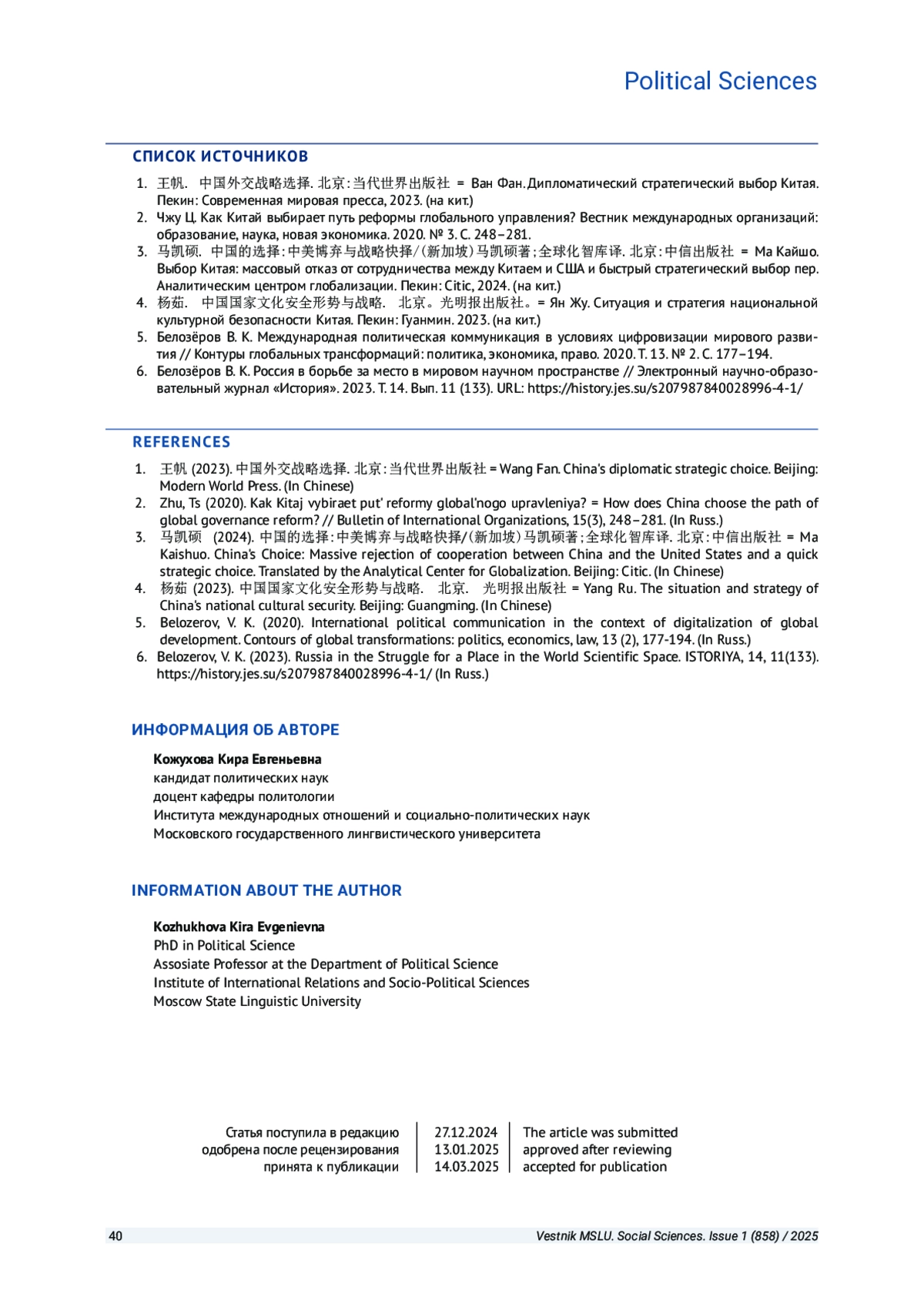 5. Белозёров В. К. Международная политическая коммуникация в условиях цифровизации мирового развития // Контуры глобальных трансформаций: политика, экономика, право. 2020. Т. 13. № 2. С. 177-194. EDN: HURULI