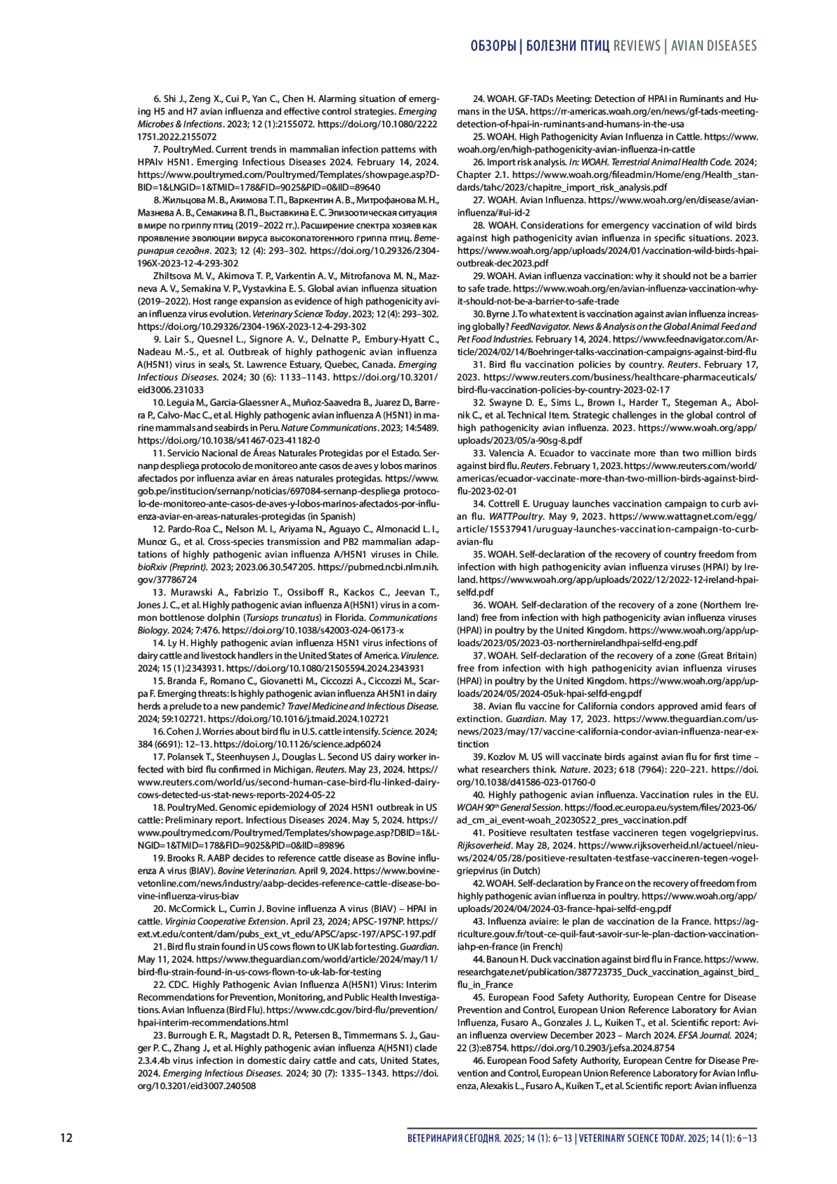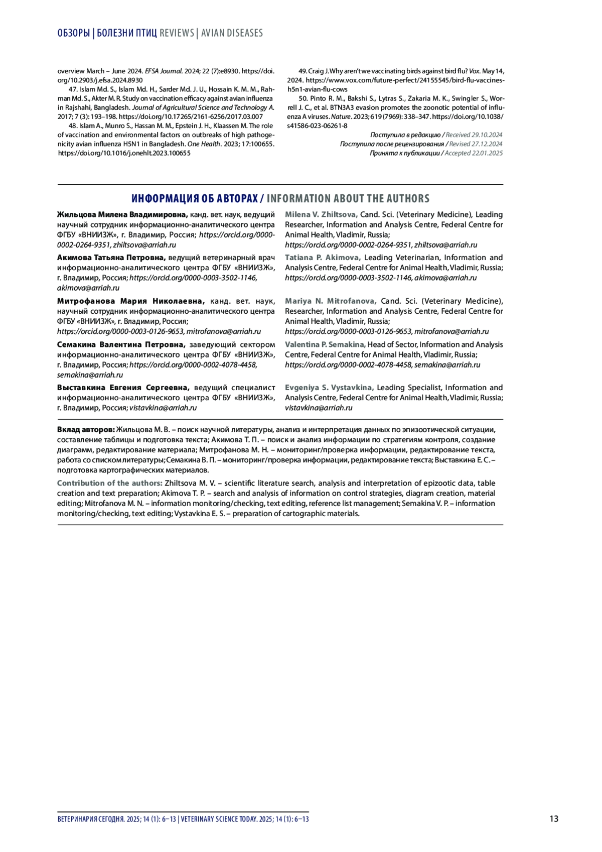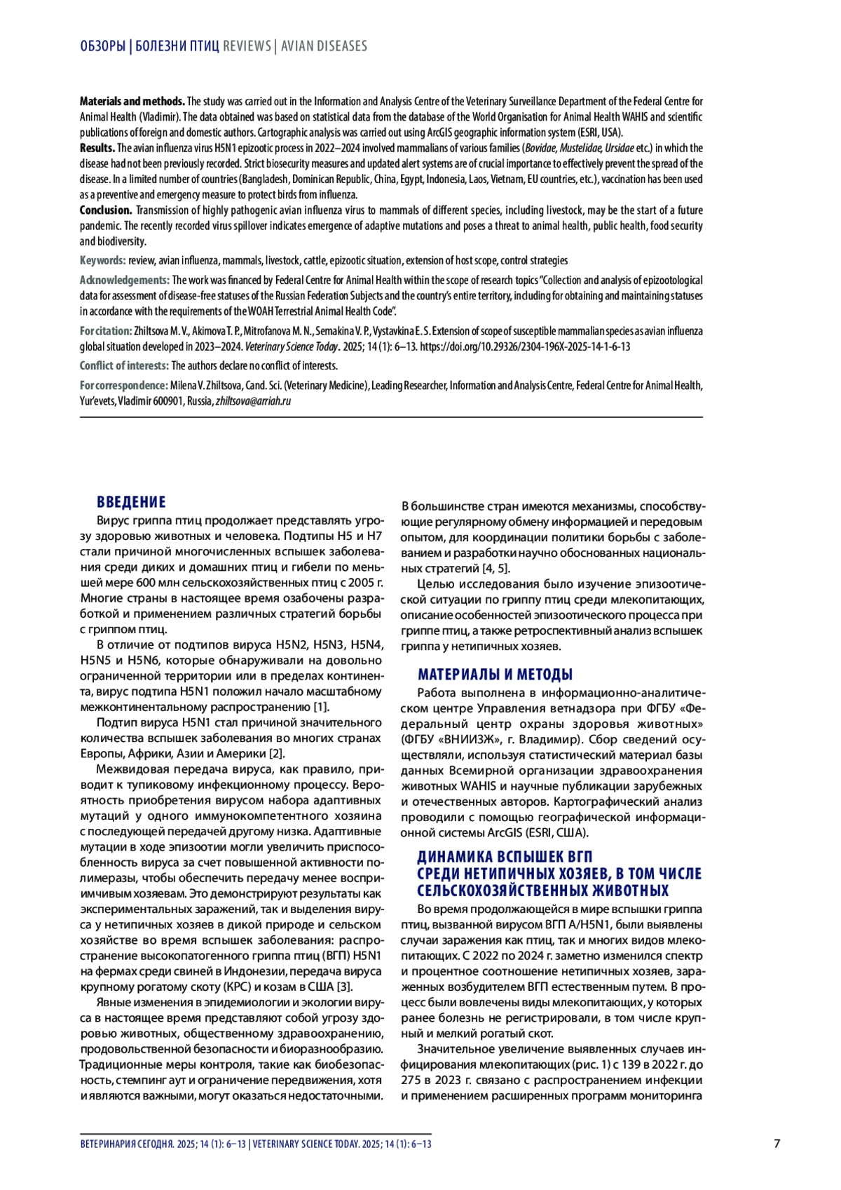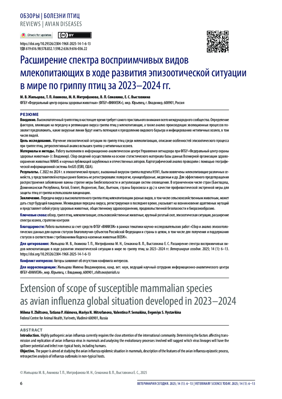 ЖИЛЬЦОВА М. В., АКИМОВА Т. П., МИТРОФАНОВА М. Н., СЕМАКИНА В. П., ВЫСТАВКИНА Е. С. РАСШИРЕНИЕ СПЕКТРА ВОСПРИИМЧИВЫХ ВИДОВ МЛЕКОПИТАЮЩИХ В ХОДЕ РАЗВИТИЯ ЭПИЗООТИЧЕСКОЙ СИТУАЦИИ В МИРЕ ПО ГРИППУ ПТИЦ ЗА 2023–2024 ГГ. // ВЕТЕРИНАРИЯ СЕГОДНЯ. 2025. № 1, ТОМ 14