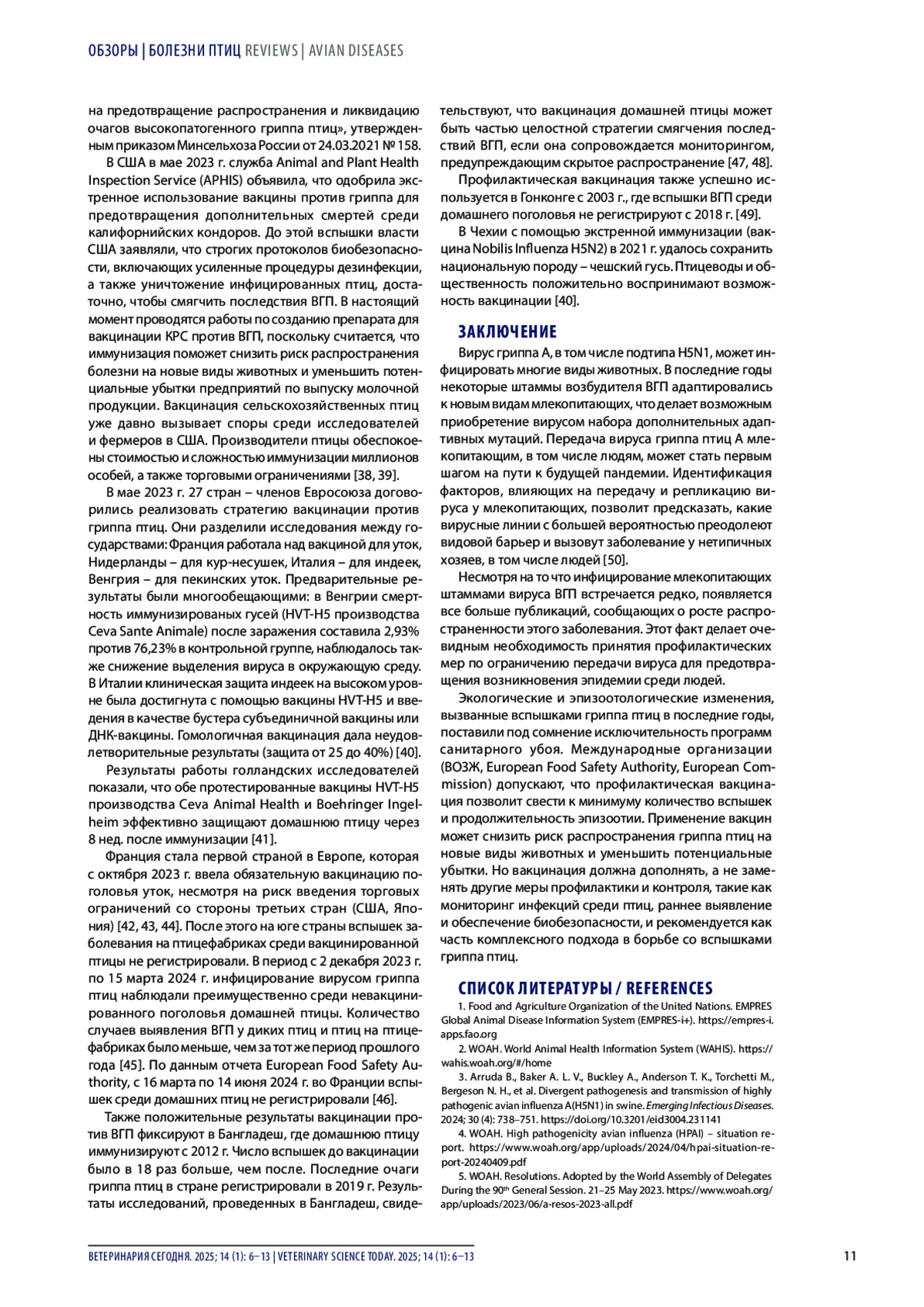 Результаты. С 2022 по 2024 г. в эпизоотический процесс, вызванный вирусом гриппа подтипа H5N1, были вовлечены млекопитающие различных семейств, у представителей которых ранее болезнь не регистрировали: полорогие, куницеобразные, медвежьи и др. Для эффективного предотвращения распространения заболевания важны строгие меры биобезопасности и актуализация систем оповещения. В ограниченном числе стран (Бангладеш, Доминиканская Республика, Китай, Египет, Индонезия, Лаос, Вьетнам, страны Евросоюза и др.) в качестве профилактической экстренной меры для защиты птиц от гриппа использовали вакцинацию.