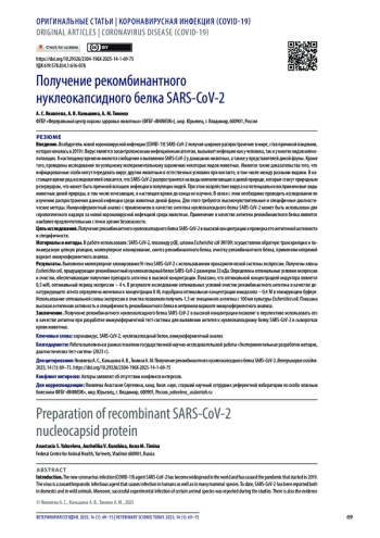 Новый коронавирус (SARS-CoV-2) стал причиной пандемии острой респираторной инфекции, которая охватила весь мир и привела к гибели нескольких миллионов человек [1]. Заболевание у инфицированного человека может проходить как бессимптомно, так и в форме тяжелой пневмонии, приводящей к смерти в случае тотального поражения легких. SARS-CoV-2 – оболочечный одноцепочечный РНК-содержащий вирус семейства Coronaviridae, рода Betacoronavirus. Вирион вируса имеет характерный вид короны с шиповидными (S), мембранными (M) и оболочечными (E) белками, расположенными в двухслойной фосфолипидной оболочке. РНК-геном размером 30 kb кодирует 16 неструктурных белков и 4 основных структурных белка: спайк (S), мембранный (M), оболочечный (E) и нуклеокапсидный (N) [2].