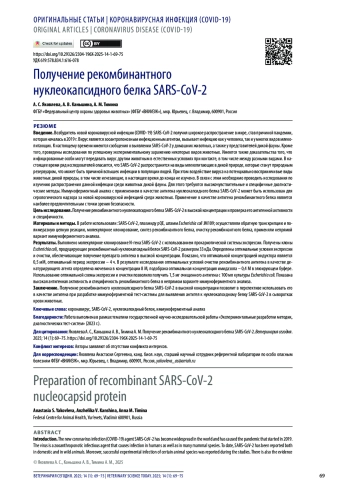 Результаты. Выполнено молекулярное клонирование N-гена SARS-CoV-2 с использованием прокариотической системы экспрессии. Получены клоны Escherichia coli, продуцирующие рекомбинантный нуклеокапсидный белок SARS-CoV-2 размером 33 кДа. Определены оптимальные условия экспрессии и очистки, обеспечивающие получение препарата антигена в высокой концентрации. Показано, что оптимальной концентрацией индуктора является 0,5 мМ, оптимальный период экспрессии – 4 ч. В результате исследования оптимальных условий очистки рекомбинантного антигена в качестве денатурирующего агента определена мочевина в концентрации 8 М, подобрана оптимальная концентрация имидазола – 0,4 М в элюирующем буфере. Использование оптимальной схемы экспрессии и очистки позволило получить 1,5 мг очищенного антигена с 100 мл культуры Escherichia coli. Показана высокая антигенная активность и специфичность рекомбинантного белка в непрямом варианте иммуноферментного анализа.