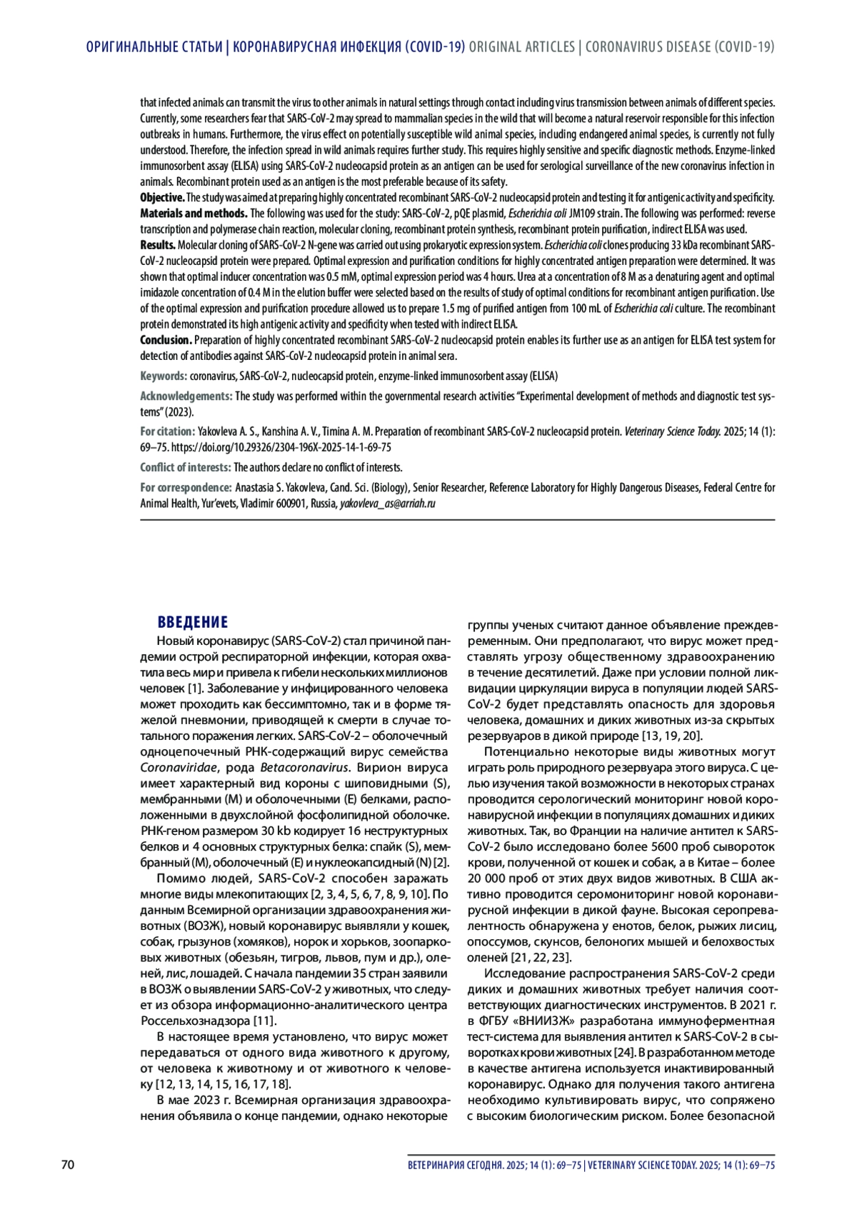 Введение. Возбудитель новой коронавирусной инфекции (COVID-19) SARS-CoV-2 получил широкое распространение в мире, став причиной пандемии, которая началась в 2019 г. Вирус является зооантропонозным инфекционным агентом, вызывает инфекцию как у человека, так и у многих видов млекопитающих. К настоящему времени имеются сообщения о выявлении SARS-CoV-2 у домашних животных, а также у представителей дикой фауны. Кроме того, проведены исследования по успешному экспериментальному заражению некоторых видов животных. Имеются также доказательства того, что инфицированные особи могут передавать вирус другим животным в естественных условиях при контакте, в том числе между разными видами. В настоящее время ряд исследователей опасается, что SARS-CoV-2 распространится на виды млекопитающих в дикой природе, которые станут природным резервуаром, что может быть причиной вспышек инфекции в популяции людей. При этом воздействие вируса на потенциально восприимчивые виды животных дикой природы, в том числе исчезающие, в настоящее время до конца не изучено. В связи с этим необходимо проводить исследования по изучению распространения данной инфекции среди животных дикой фауны. Для этого требуются высокочувствительные и специфичные диагностические методы. Иммуноферментный анализ с применением в качестве антигена нуклеокапсидного белка SARS-CoV-2 может быть использован для серологического надзора за новой коронавирусной инфекцией среди животных. Применение в качестве антигена рекомбинантного белка является наиболее предпочтительным с точки зрения безопасности.