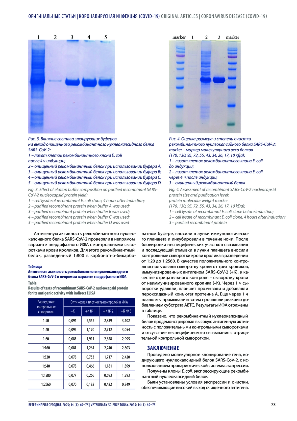 Заключение. Получение рекомбинантного нуклеокапсидного белка SARS-CoV-2 в высокой концентрации позволит в перспективе использовать его в качестве антигена при разработке иммуноферментной тест-системы для выявления антител к нуклеокапсидному белку SARS-CoV-2 в сыворотках крови животных.