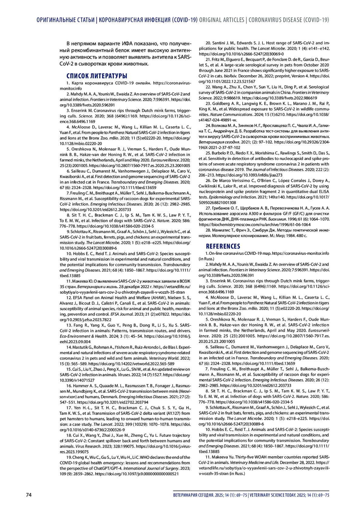 24. Волкова М. А., Зиняков Н. Г., Ярославцева П. С., Чвала И. А., Галкина Т. С., Андрейчук Д. Б. Разработка тест-системы для выявления антител к вирусу SARS-CoV-2 в сыворотках крови восприимчивых животных. Ветеринария сегодня. 2021; (2): 97-102. DOI: 10.29326/2304-196X-2021-2-37-97-102