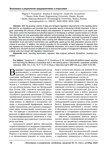 В условиях роста объемов данных и жестких требований регуляторов в банковском секторе необходимость в оперативном и точном способе формирования отчетности становится критически важной. В связи с этим автоматизация процесса анализа данных и подготовки отчетов для органов надзора является актуальной задачей. Данное исследование охватывает теоретические и практические аспекты разработки программного решения на основе BI-платформы, позволяющего не только автоматизировать сбор и обработку данных, но и минимизировать риски ошибок при формировании отчетности. Основное внимание уделено интеграции с корпоративными хранилищами данных, автоматическому учету актуальных курсов валют и обеспечению гибкости при работе с различными отчетными периодами. Использование современных инструментов визуализации и встроенных механизмов позволяет значительно ускорить процесс подготовки данных и повысить их точность. Кроме того, решение предусматривает возможность оперативного реагирования на запросы регулятора и обеспечивает защиту конфиденциальной информации. В результате внедрения этого программного средства банк получает эффективный инструмент для повышения качества управленческих решений, снижения операционных затрат и соответствия требованиям регулятивных органов.