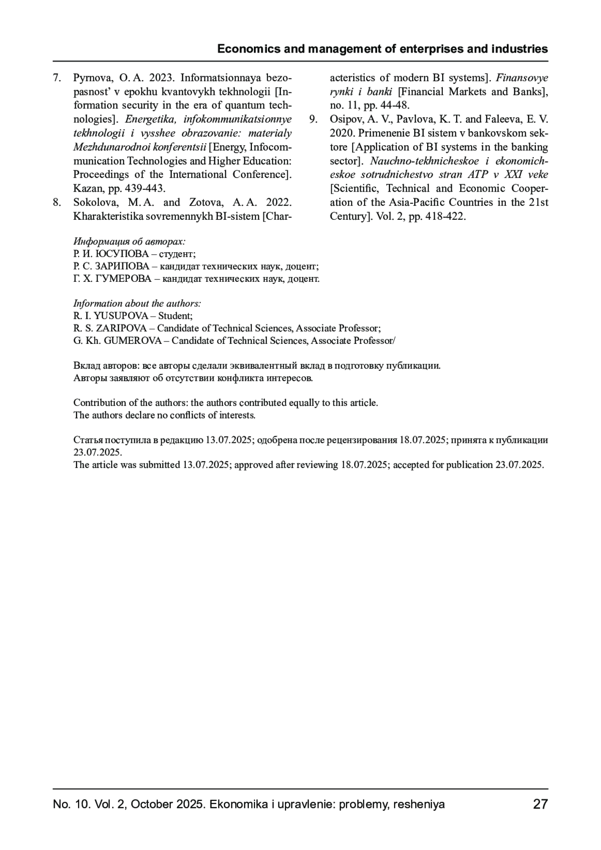 5. Юсупова Р. И., Зарипова Р. С. Роль BI-систем в бизнесе // Технологический суверенитет и цифровая трансформация. Материалы международной научно-технической конференции. Казань, 2025. С. 432-435. EDN: NGEMAU