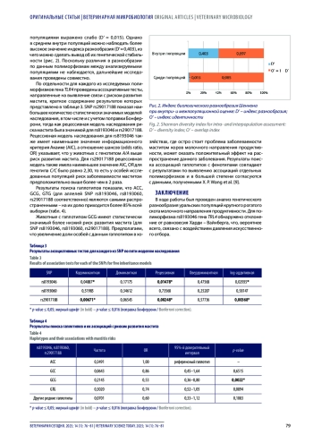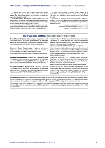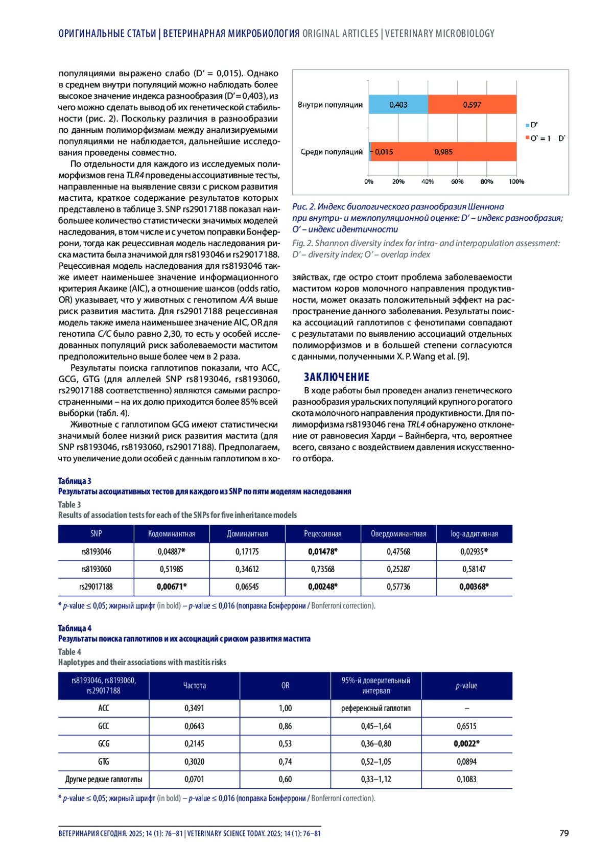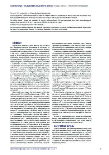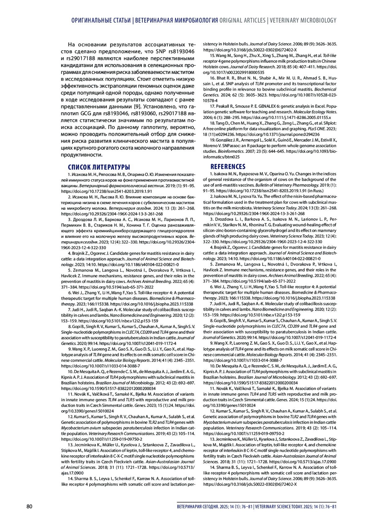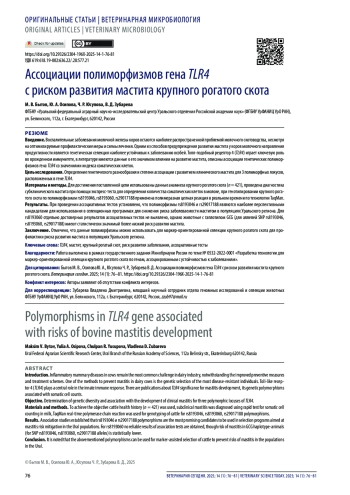 БЫТОВ М. В., ОСИПОВА Ю. А., ЮСУПОВА Ч. Р., ЗУБАРЕВА В. Д. АССОЦИАЦИИ ПОЛИМОРФИЗМОВ ГЕНА TLR4 С РИСКОМ РАЗВИТИЯ МАСТИТА КРУПНОГО РОГАТОГО СКОТА // ВЕТЕРИНАРИЯ СЕГОДНЯ. 2025. № 1, ТОМ 14