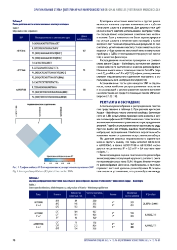 Цель исследования. Определение генетического разнообразия и степени ассоциации с развитием клинического мастита для 3 полиморфных локусов, расположенных в гене TLR4. Материалы и методы. Для достижения поставленной цели использованы данные анамнеза крупного рогатого скота (n = 421), проведена диагностика субклинического мастита при помощи экспресс-теста для определения количества соматических клеток в молоке, при генотипировании крупного рогатого скота по полиморфизмам rs8193046, rs8193060, rs29017188 применена полимеразная цепная реакция в реальном времени по технологии TaqMan.