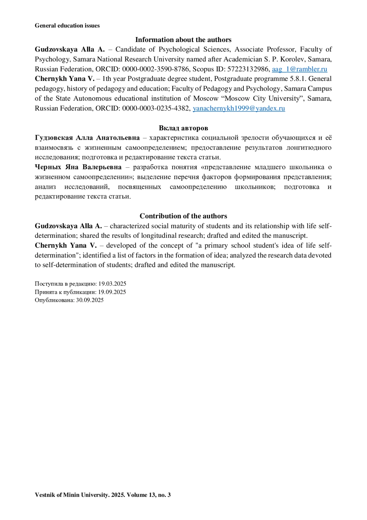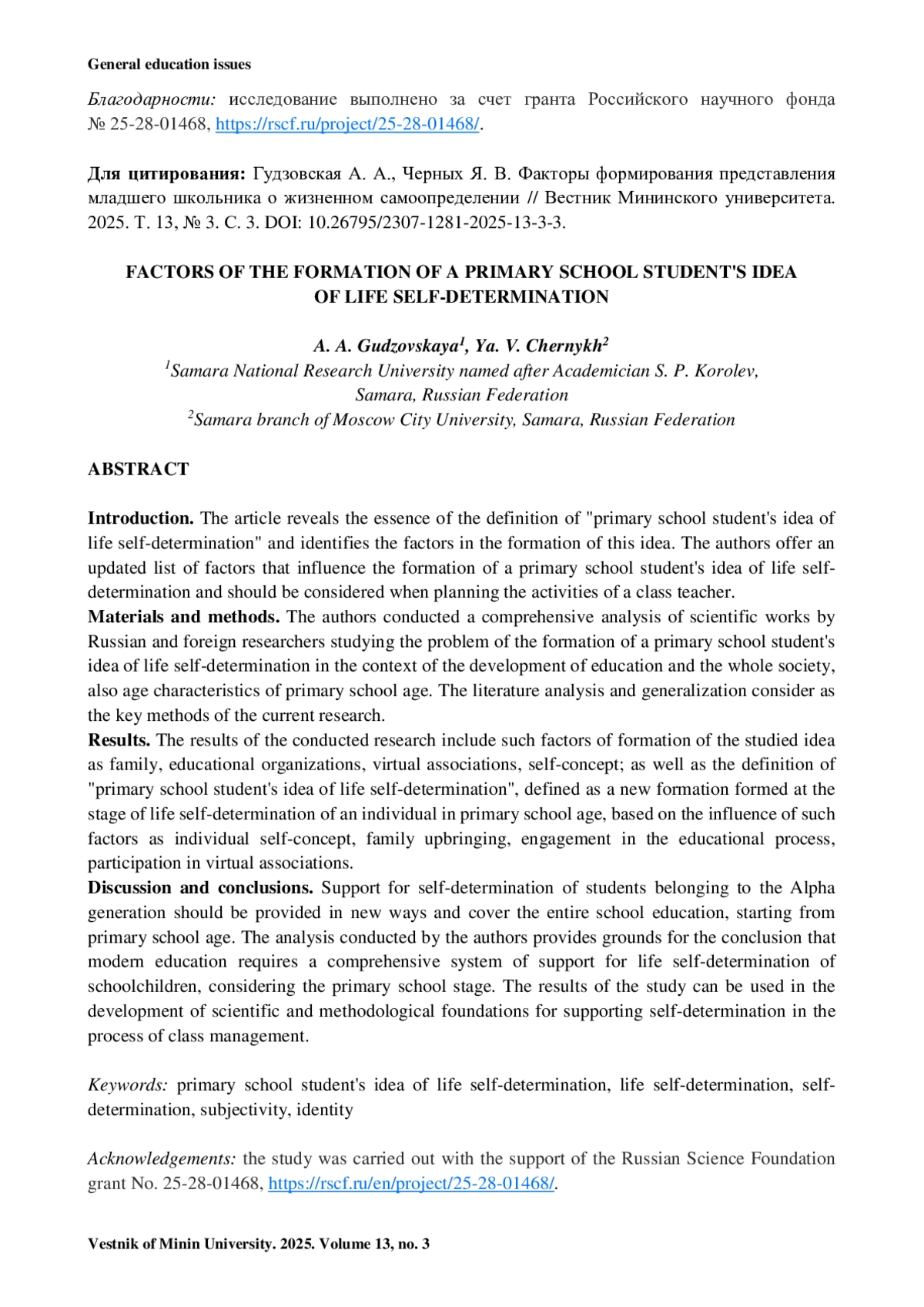 ГУДЗОВСКАЯ А. А., ЧЕРНЫХ Я. В. ФАКТОРЫ ФОРМИРОВАНИЯ ПРЕДСТАВЛЕНИЯ МЛАДШЕГО ШКОЛЬНИКА О ЖИЗНЕННОМ САМООПРЕДЕЛЕНИИ // ВЕСТНИК МИНИНСКОГО УНИВЕРСИТЕТА. 2025. ТОМ 13, № 3