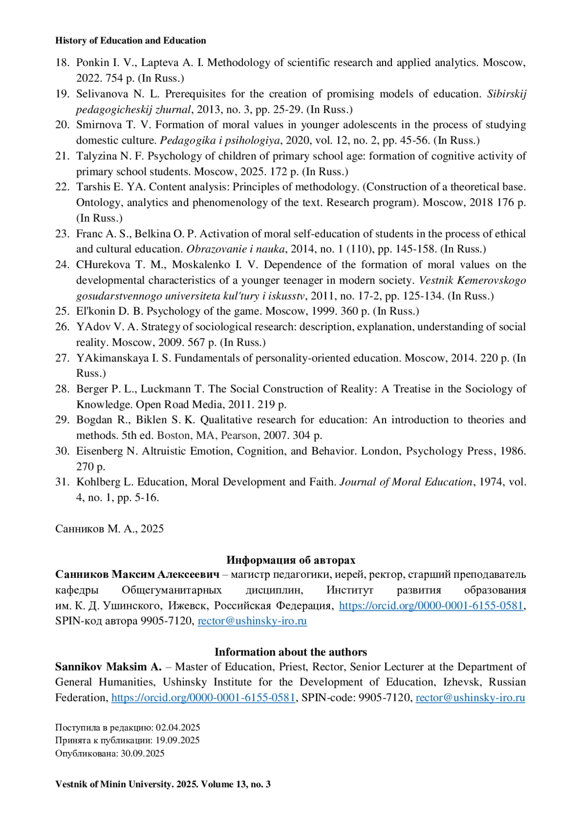 20. Смирнова Т. В. Формирование нравственных ценностей у младших подростков в процессе изучения отечественной культуры // Педагогика и психология. 2020. Т. 12, № 2. С. 45-56.