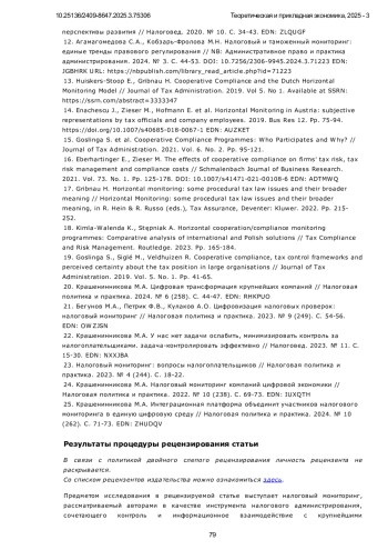14. Enachescu J., Zieser M., Hofmann E. et al. Horizontal Monitoring in Austria: subjective representations by tax officials and company employees. 2019. Bus Res 12. Pp. 75-94. DOI: 10.1007/s40685-018-0067-1 EDN: AUZKET