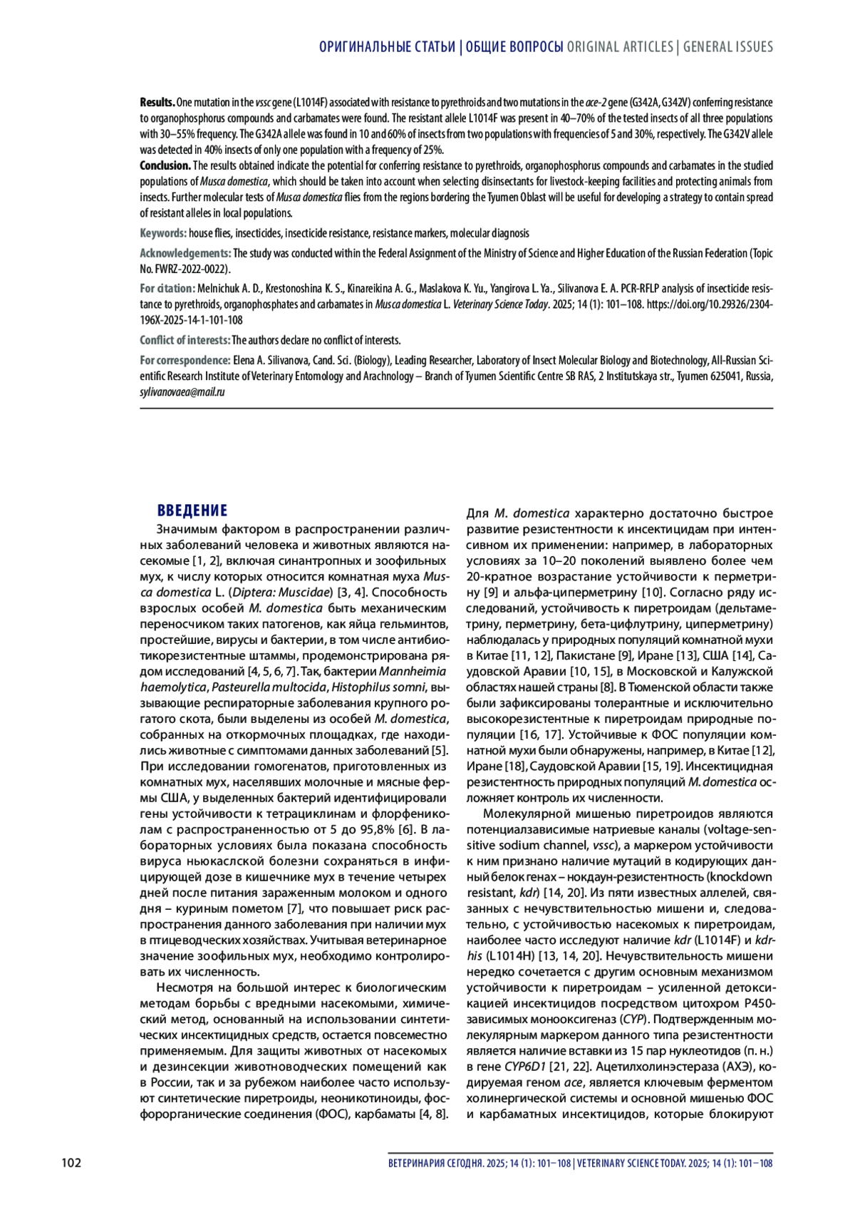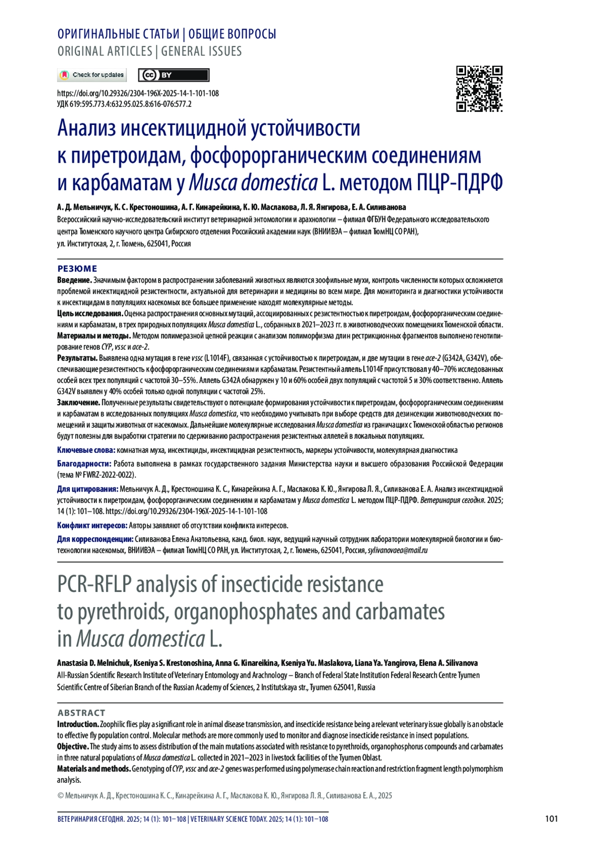 МЕЛЬНИЧУК А. Д., КРЕСТОНОШИНА К. С., КИНАРЕЙКИНА А. Г., МАСЛАКОВА К. Ю., ЯНГИРОВА Л. Я., СИЛИВАНОВА Е. А. АНАЛИЗ ИНСЕКТИЦИДНОЙ УСТОЙЧИВОСТИ К ПИРЕТРОИДАМ, ФОСФОРОРГАНИЧЕСКИМ СОЕДИНЕНИЯМ И КАРБАМАТАМ У MUSCA DOMESTICA L. МЕТОДОМ ПЦР-ПДРФ // ВЕТЕРИНАРИЯ СЕГОДНЯ. 2025. № 1, ТОМ 14