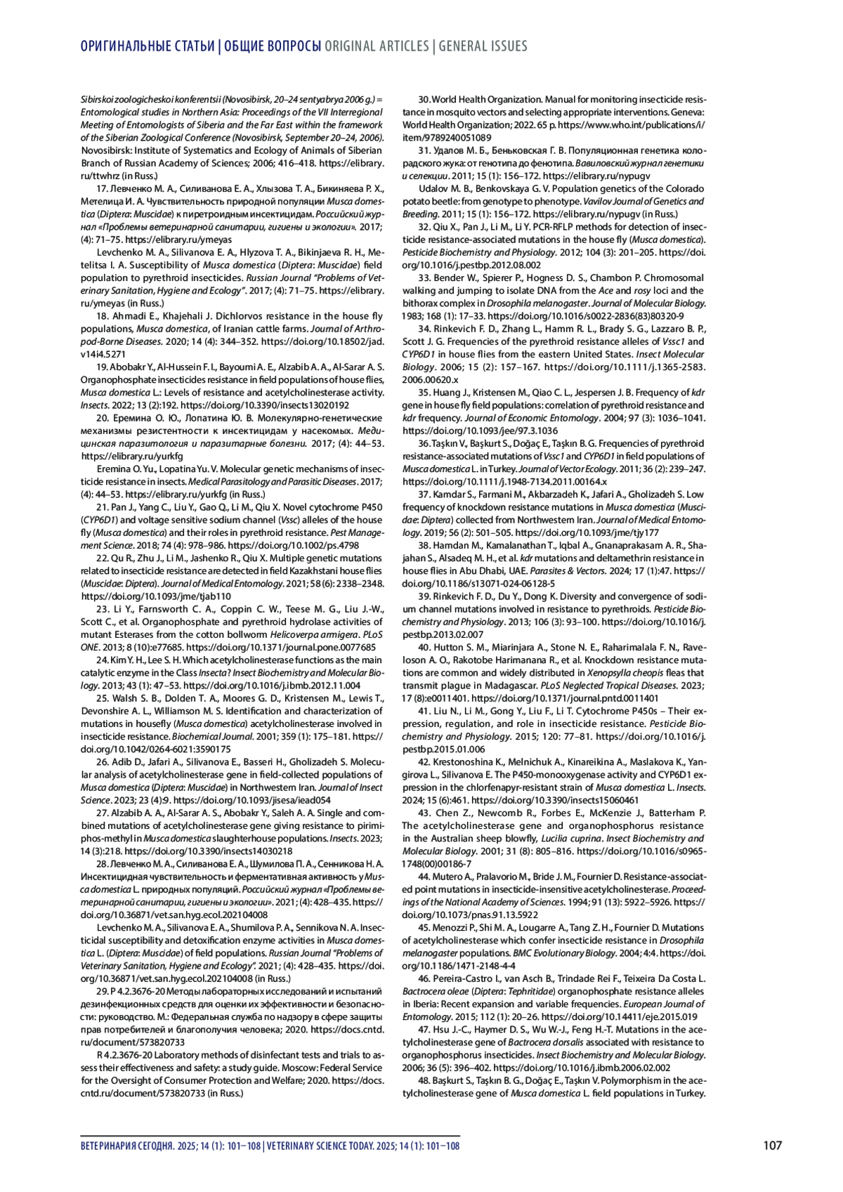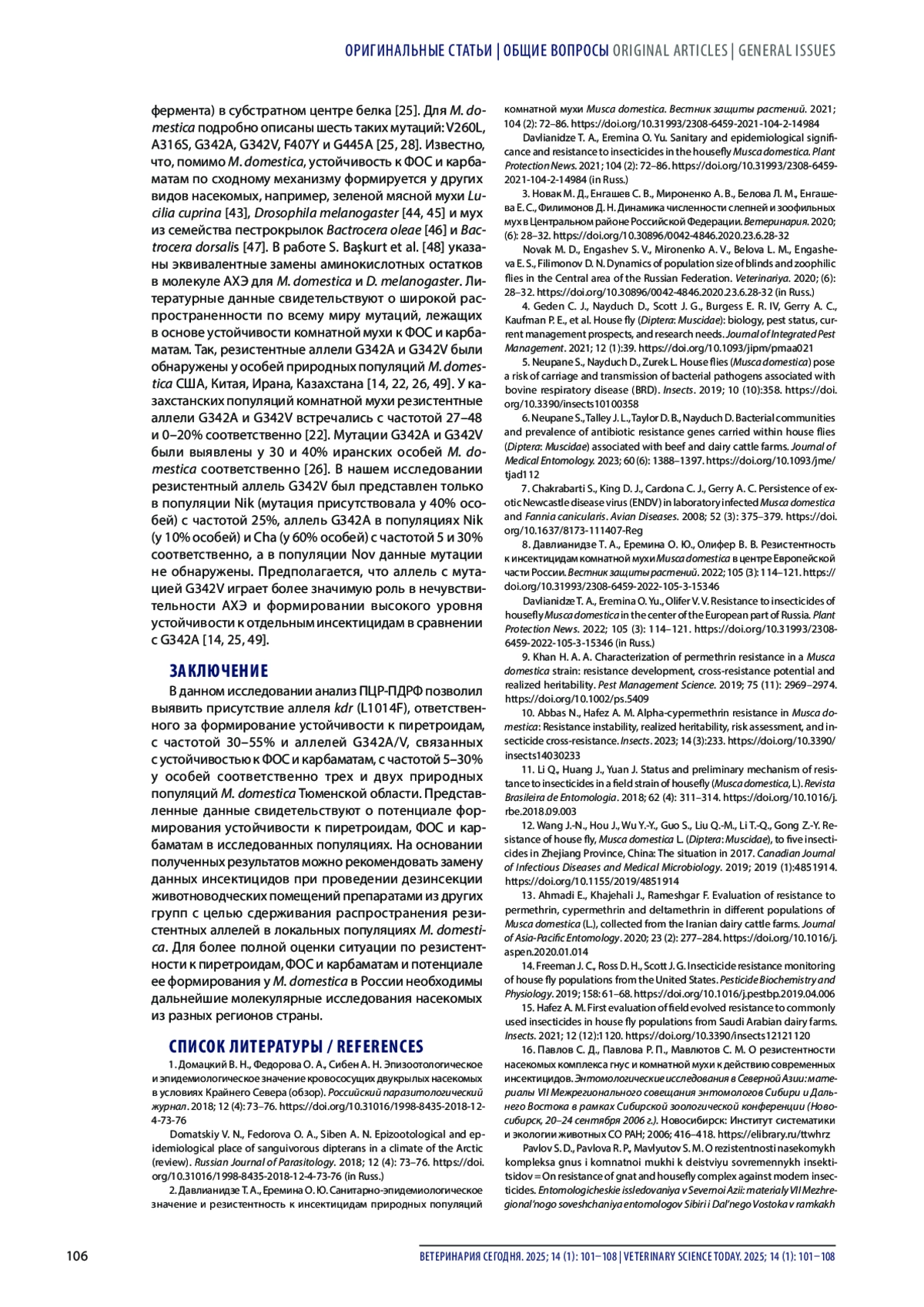 Заключение. Полученные результаты свидетельствуют о потенциале формирования устойчивости к пиретроидам, фосфорорганическим соединениям и карбаматам в исследованных популяциях Musca domestica, что необходимо учитывать при выборе средств для дезинсекции животноводческих помещений и защиты животных от насекомых. Дальнейшие молекулярные исследования Musca domestica из граничащих с Тюменской областью регионов будут полезны для выработки стратегии по сдерживанию распространения резистентных аллелей в локальных популяциях.