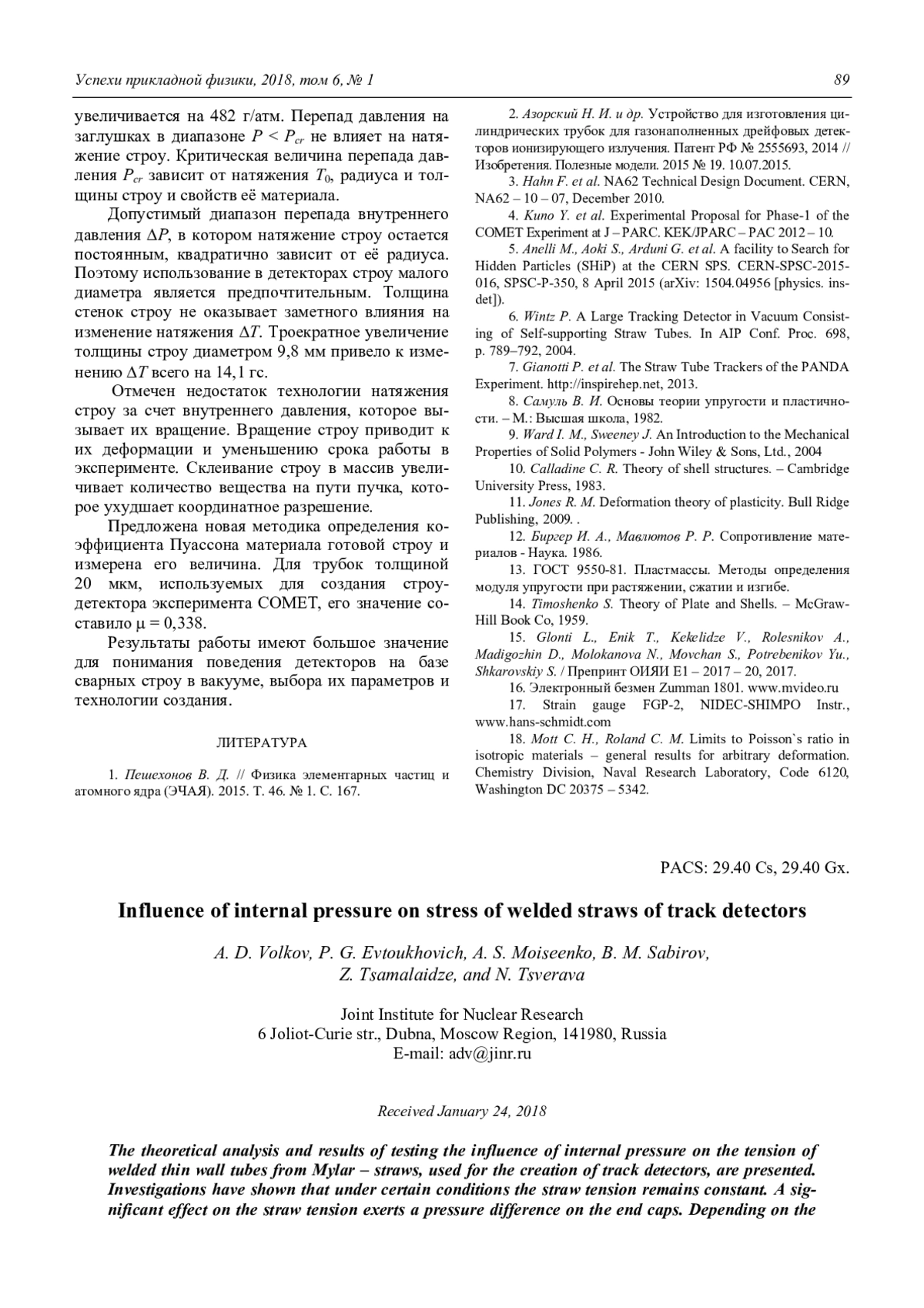 ВОЛКОВ А. Д., ЕВТУХОВИЧ П. Г., МОИСЕЕНКО А. С., САБИРОВ Б. М., ЦАМАЛАИДЗЕ З., ЦВЕРАВА Н. ВЛИЯНИЕ ВНУТРЕННЕГО ДАВЛЕНИЯ НА НАТЯЖЕНИЕ В СВАРНЫХ СТРОУ ТРЕКОВОГО ДЕТЕКТОРА // УСПЕХИ ПРИКЛАДНОЙ ФИЗИКИ. 2018. ТОМ 6, №1