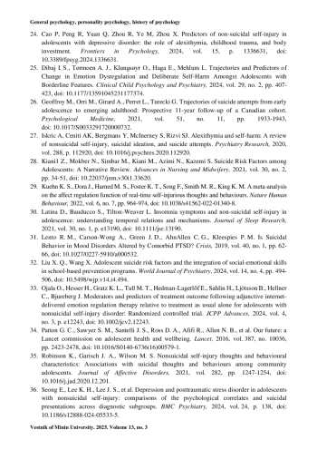 24. Cao P, Peng R, Yuan Q, Zhou R, Ye M, Zhou X. Predictors of non-suicidal self-injury in adolescents with depressive disorder: the role of alexithymia, childhood trauma, and body investment // Frontiers in Psychology. 2024. Vol. 15. P. 1336631. https://doi.org/10.3389/fpsyg.2024.1336631.
