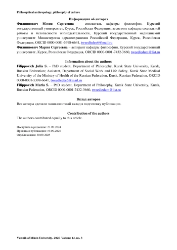 Введение. В современную философскую оптику попадают феномены, раскрывающие антропологическую субъектность как самого человека, так и в отношении с другими. Эти феномены тем не менее могут рассматриваться и самостоятельно. В статье мы рассмотрим некоторые из них, которые, как нам кажется, выходят на первую линию в настоящее время: одиночество, усталость и доверие. В философско-антропологических подходах мыслителей двадцатого и двадцать первого веков (Х. Арендт, М. Шеллер, М. Хайдеггер, Бён-Чхоль Хан и другие) усматривается ответ на вопрос о том, кто такой человек: каковы его место, мера и влияние в новой структурной реальности, которую он создаёт. Материалы и методы. Материалом для исследования стали работы отечественных и зарубежных философов, которые были проанализированы с использованием герменевтического, философско-компаративистского методов. В частности, были изучены конкретные характеристики, описывающие связь человека с окружающей реальностью. Результаты исследования. Проведённое исследование показывает, что человек становится личностью при условии осмысленной работы, что обуславливается предлагаемым ему выбором в условиях фрагментарности общества. Из-за частичного, разрозненного, фрагментарного процесса взаимодействия человека с обществом первый склонен не столько к обогащению своей личности, сколько к потребительскому времяпровождению. Через категорию доверия это звучит следующим образом: у того, кто доверяет, больше времени прожить жизнь полно, поскольку он знает, чего ему не хватает, и понимает, как этим можно пользоваться в жизни. Несмотря на кажущийся негативизм, усталость положительно стимулирует человека к осознанию имеющихся навыков и социального опыта, а также является «паузой», т. е. адаптацией накопившегося опыта. Обсуждение и заключения. Масштабные социальные потрясения приводят личность к состоянию отчуждённости, что выражается в стремлении к одиночеству, при этом ощущение усталости может стать ключом к изменению ситуации. Современное общество говорит, что субъект может сделать, что звучит как вера в способности человека выполнить ту или иную задачу. Однако подобное размывание границ «не\могу» ведёт к тому, что возрастает уровень продуктивности и в некоторой степени изнурённости, которая в конечном счёте может привести к переживанию одиночества и снижению доверия к окружающим людям. Большая самостоятельность приводит к апатии, в том числе к труду, которая отстраняет от окружающего мира, потому ведет к уменьшению доверия. Однако ключевым превентивным механизмом в современном обществе может стать дистанцированность в форме усталости, которая предъявляет обществу не сколько равнодушие, сколько совершенное волевое решение «прерваться на перерыв», а значит, ожидание от общества доверительного отношения.
