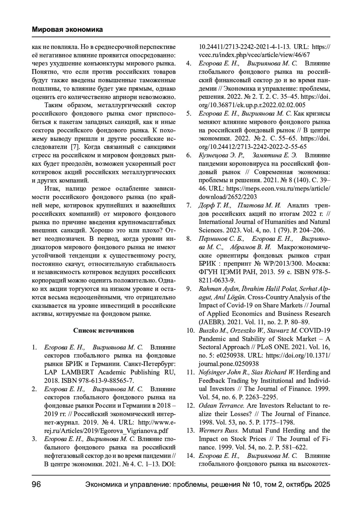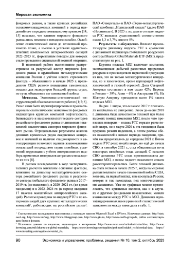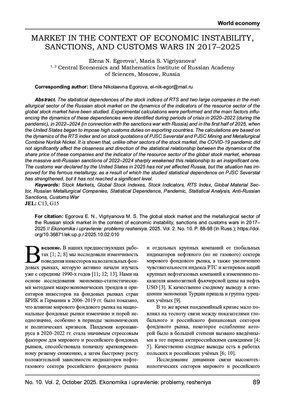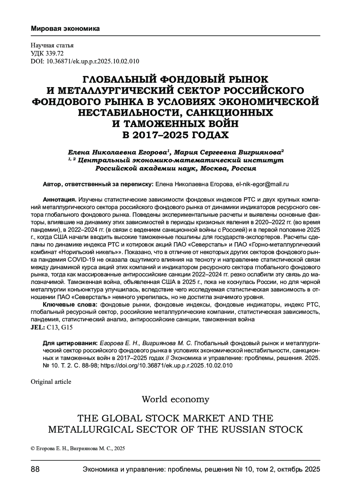 ЕГОРОВА Е. Н., ВИГРИЯНОВА М. С. ГЛОБАЛЬНЫЙ ФОНДОВЫЙ РЫНОК И МЕТАЛЛУРГИЧЕСКИЙ СЕКТОР РОССИЙСКОГО ФОНДОВОГО РЫНКА В УСЛОВИЯХ ЭКОНОМИЧЕСКОЙ НЕСТАБИЛЬНОСТИ, САНКЦИОННЫХ И ТАМОЖЕННЫХ ВОЙН В 2017-2025 ГОДАХ // ЭКОНОМИКА И УПРАВЛЕНИЕ: ПРОБЛЕМЫ, РЕШЕНИЯ. 2025. ТОМ 2 № 10
