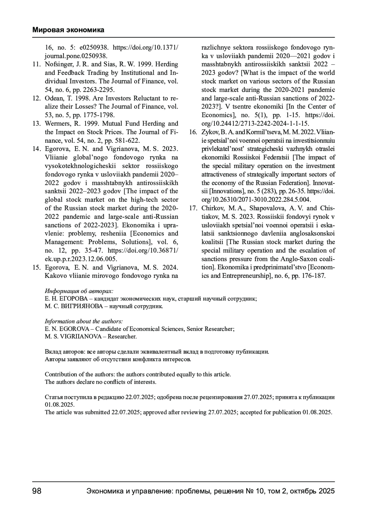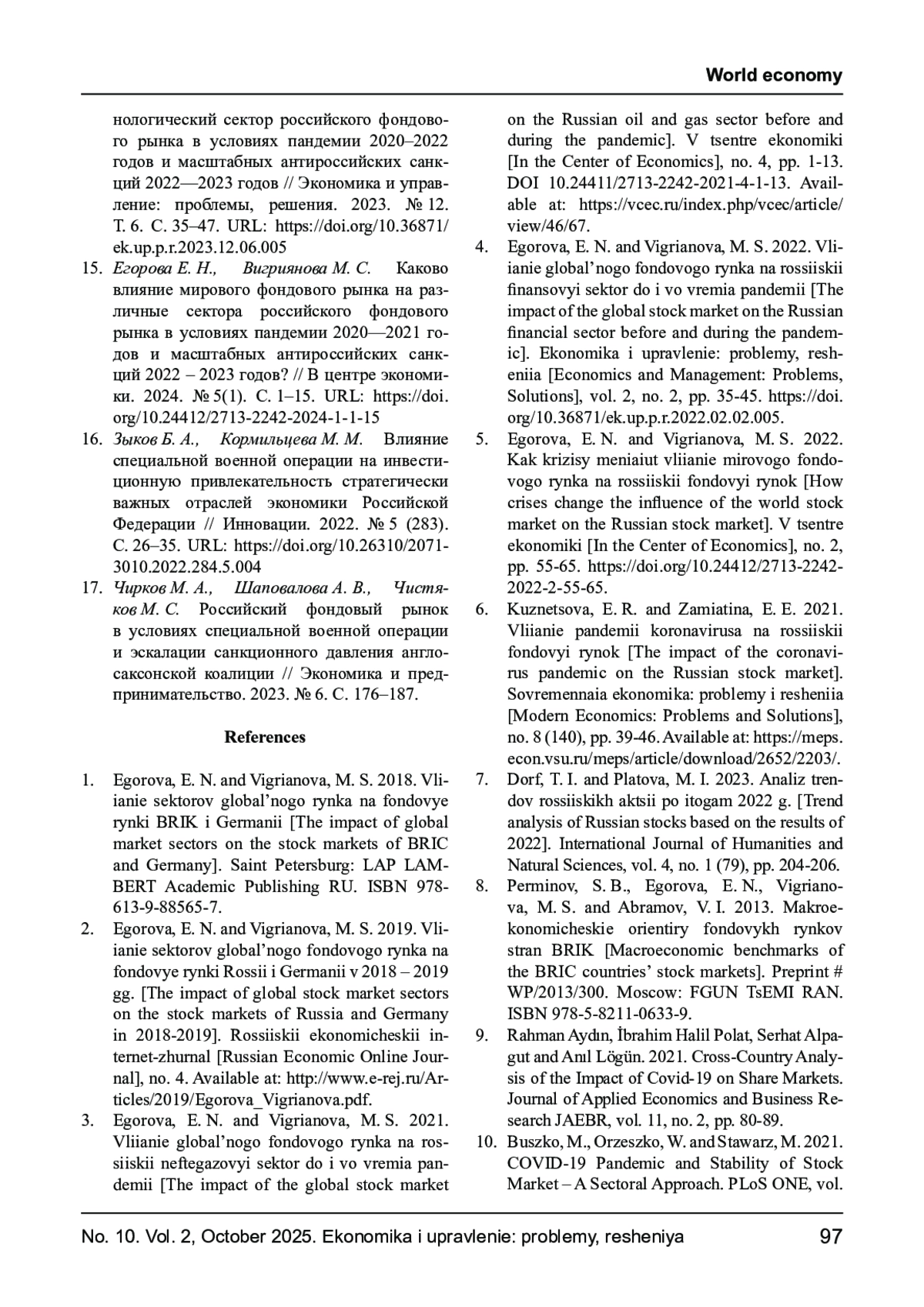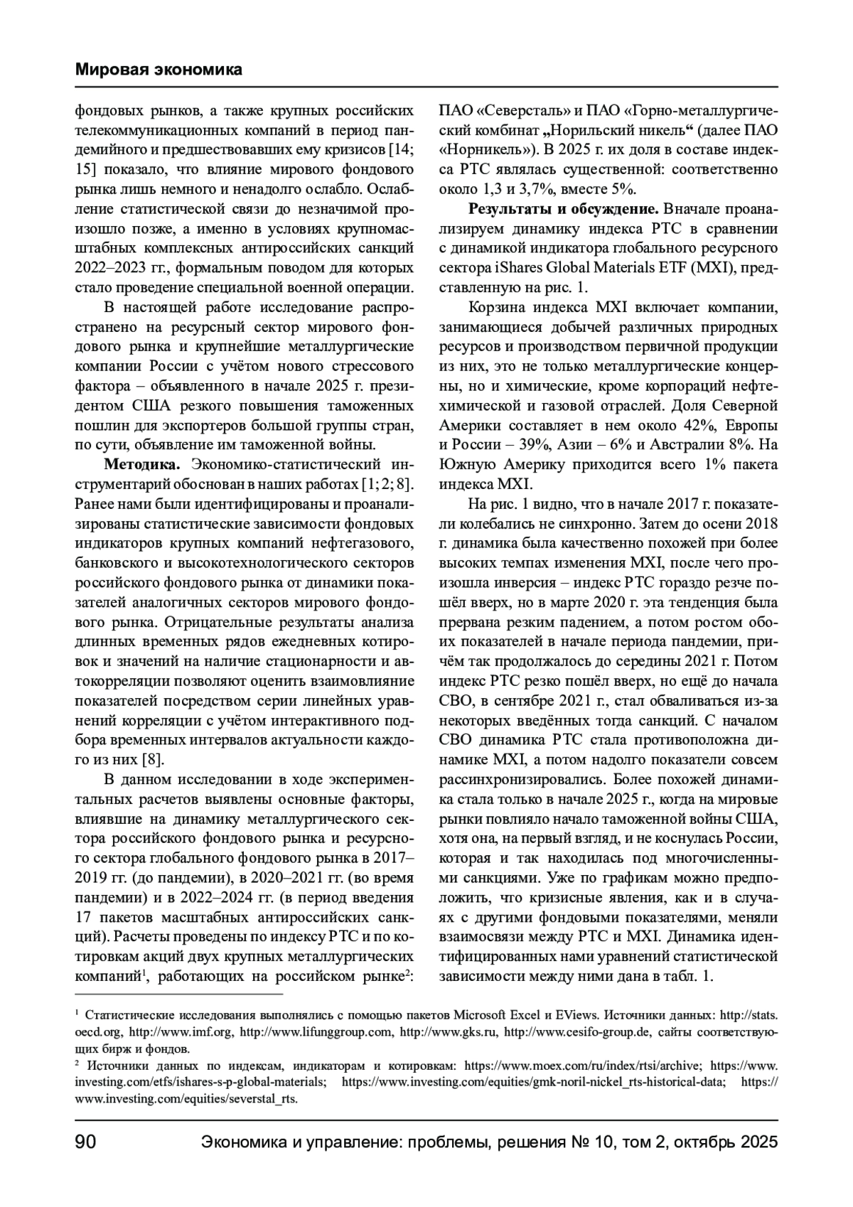 ЕГОРОВА Е. Н., ВИГРИЯНОВА М. С. ГЛОБАЛЬНЫЙ ФОНДОВЫЙ РЫНОК И МЕТАЛЛУРГИЧЕСКИЙ СЕКТОР РОССИЙСКОГО ФОНДОВОГО РЫНКА В УСЛОВИЯХ ЭКОНОМИЧЕСКОЙ НЕСТАБИЛЬНОСТИ, САНКЦИОННЫХ И ТАМОЖЕННЫХ ВОЙН В 2017-2025 ГОДАХ // ЭКОНОМИКА И УПРАВЛЕНИЕ: ПРОБЛЕМЫ, РЕШЕНИЯ. 2025. ТОМ 2 № 10