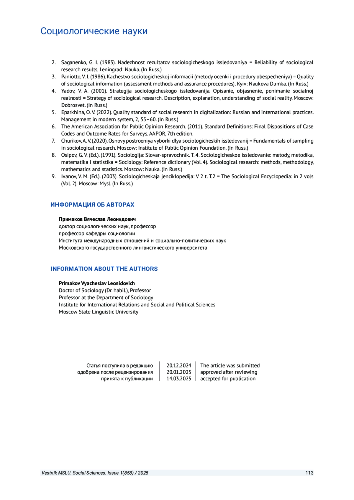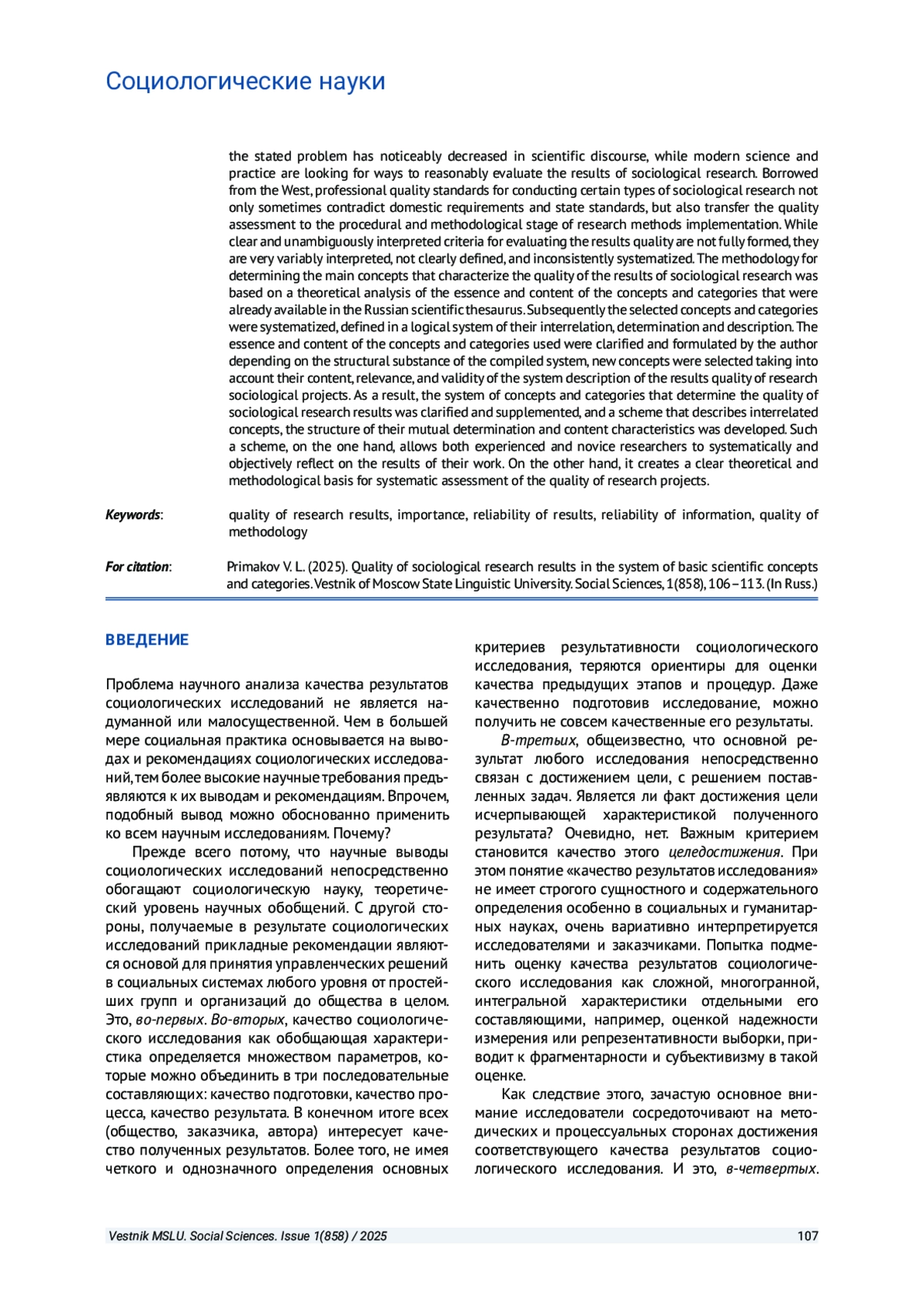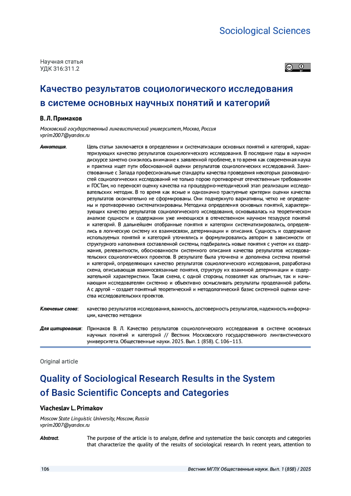 ПРИМАКОВ В. Л. КАЧЕСТВО РЕЗУЛЬТАТОВ СОЦИОЛОГИЧЕСКОГО ИССЛЕДОВАНИЯ В СИСТЕМЕ ОСНОВНЫХ НАУЧНЫХ ПОНЯТИЙ И КАТЕГОРИЙ // ВЕСТНИК МОСКОВСКОГО ГОСУДАРСТВЕННОГО ЛИНГВИСТИЧЕСКОГО УНИВЕРСИТЕТА. ОБЩЕСТВЕННЫЕ НАУКИ. 2025. № 1 (858)