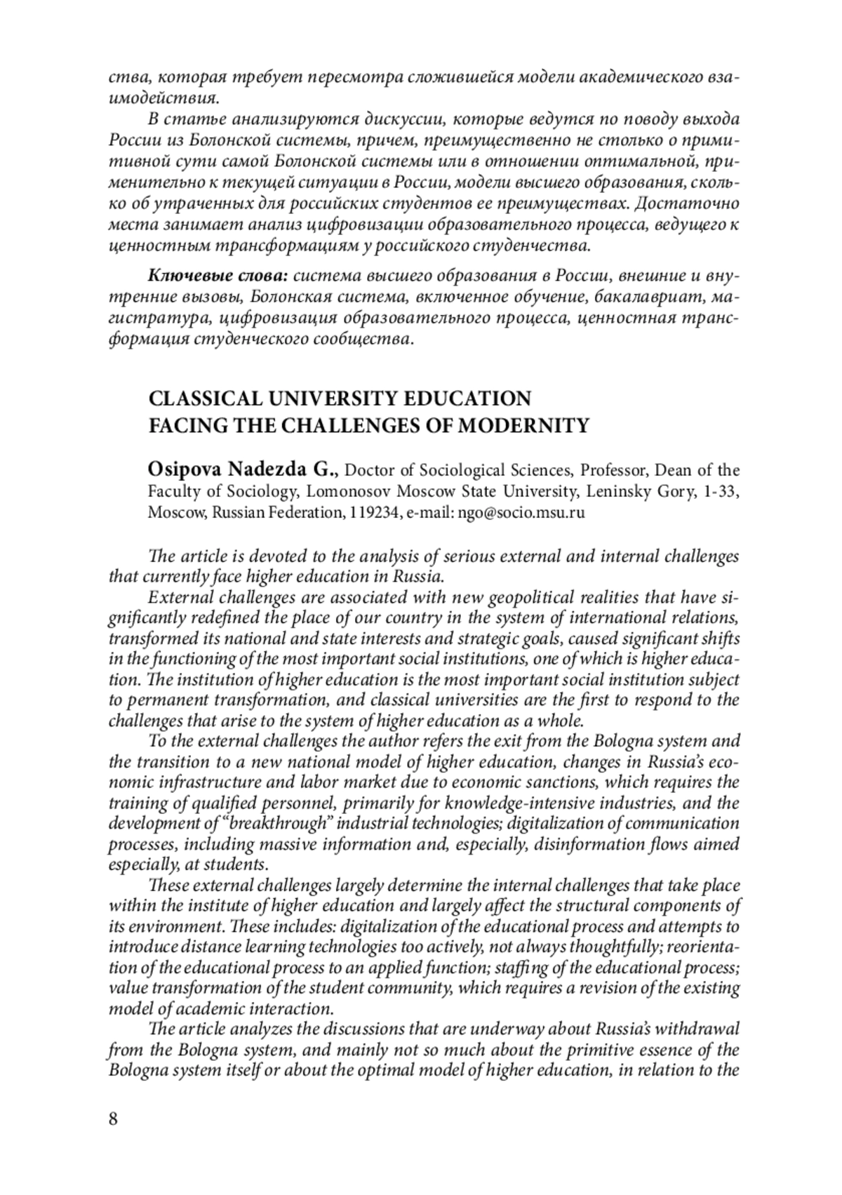 10. Осипова Н.Г., Гавриленко О.В., Прончев Г.Б., Дорцева Е.В. Социологическое образование перед вызовами пандемии: новые образовательные техноло-гии. Вестник Московского университета. Серия 18. Cоциология и полито-логия. 2022. № 2. С. 9-48.