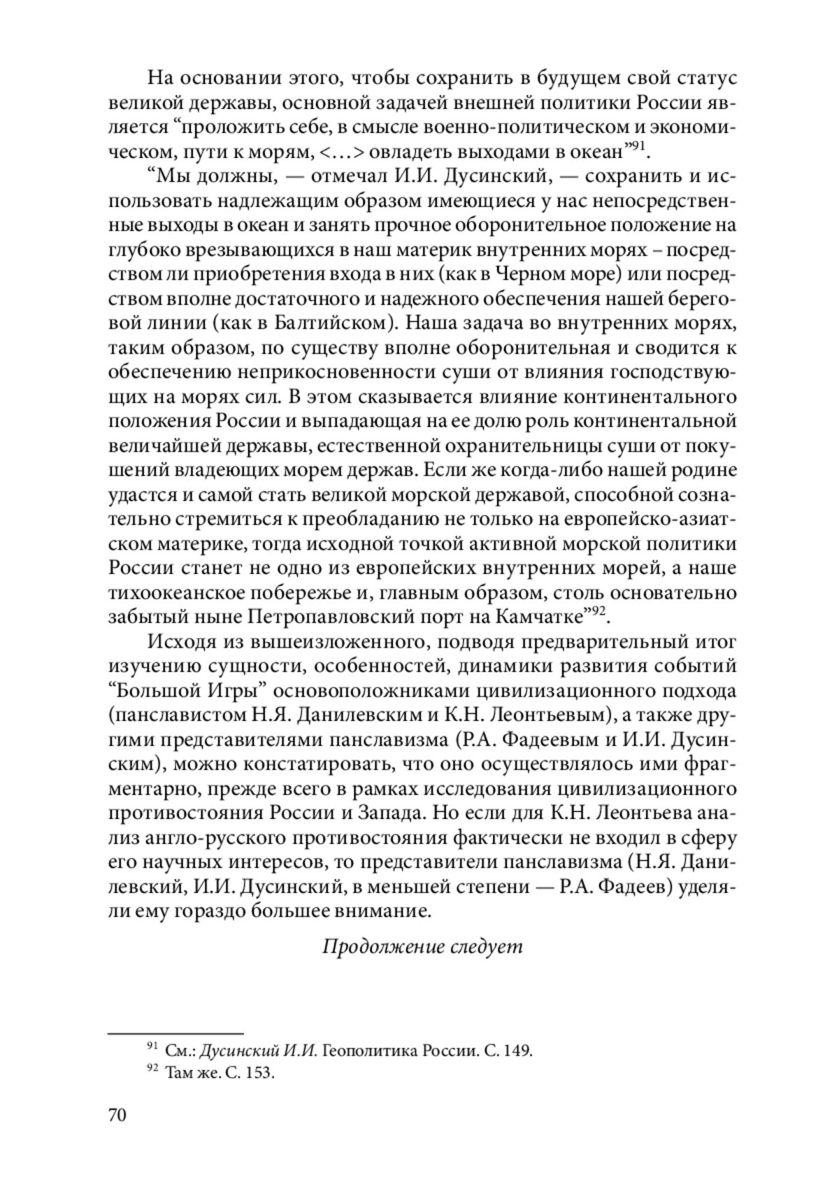 В то же время, отмечает автор статьи, осмысление сути и особенностей развития событий “Большой Игры” представителями русской школы геополитики в значительной степени осуществлялось фрагментарно, часто в аспекте анализа многовекового цивилизационного противостояния России и романо-германского культурно-исторического типа (западноевропейской великой культуры, цивилизации), а не чисто континенталистских концепций.