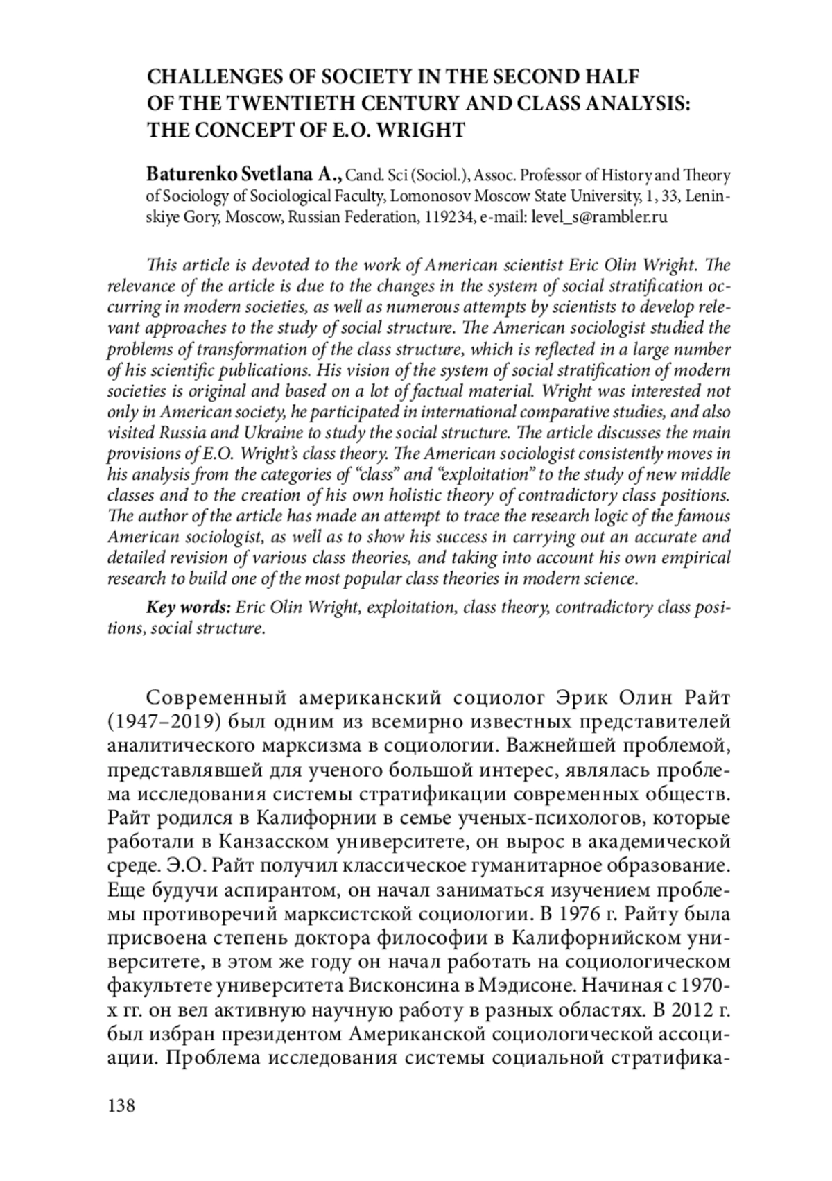 Данная статья посвящена творчеству американского ученого Эрика Олина Райта. Актуальность статьи обусловлена изменениями системы социальной стратификации, происходящими в современных обществах, а также многочисленными попытками ученых разработать релевантные подходы для изучения социальной структуры. Американский социолог исследовал проблемы трансформации классовой структуры, что отражено в большом количестве его научных публикаций. Его видение системы социальной стратификации современных обществ отличается оригинальностью и основано на большом фактическом материале. Для Райта интерес представляло не только американское общество, он участвовал в международных сравнительных исследованиях, а также посещал Россию и Украину с целью изучения социальной структуры. В статье рассматриваются основные положения классовой теории Э. О. Райта. Американский социолог последовательно продвигается в своем анализе от категорий «класс» и «эксплуатация» к исследованию новых средних классов и к созданию собственной целостной теории противоречивых классовых позиций. Автор статьи предприняла попытку проследить исследовательскую логику известного американского социолога, а также показать его успехи в осуществлении точного и подробного пересмотра различных классовых теорий, и с учетом собственных эмпирических исследований выстроить одну из самых популярных в современной науке классовых теорий.