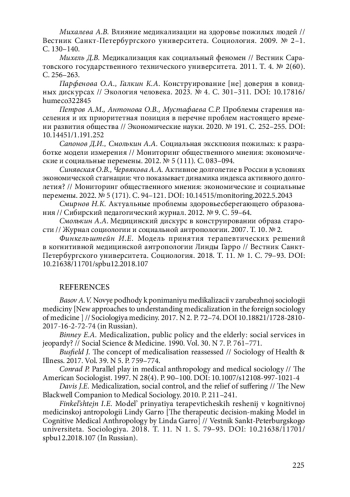 В статье рассматриваются особенности влияния медикализации на индивидуальные представления пожилых людей о своем собственном здоровье. Эмпирическую базу исследования составили 60 интервью с пожилыми жителями Санкт-Петербурга различных поколений 65+ и 75+ по 30 интервью с представителями каждого поколения. Основной метод анализа-тематический. В ходе исследования было определено, что в России пожилой возраст неразрывно связан с медикализацией этого состояния и пожилые люди образуют особую группу, которая постоянно подвержена проблеме медикализации возраста. В ходе исследования нами выяснено, что дискриминация пожилых людей исходя из плохого здоровья в пожилом возрасте присутствует, как в рамках приватного общения с родственниками и близкими так и распространенна в различных дискурсах в СМИ и активно поддерживается врачами и другими медицинскими работниками. Нарративы интервью обозначили важную проблему, а именно связь пожилого возраста и плохого самочувствия, что становится причиной определения своего пожилого возраста самим пожилыми людьми как времени проблем и сложностей со здоровьем. Сама проблема медикализации крайне значима и труднорешаема на данном этапе. Проблема медикализации пожилого возраста приводит к тому, что в обществе начинает развиваться барьеры для пожилых людей и пожилой возраст воспринимается с позиции минимизации возможных проблем, связанных со здоровьем. Значимым в данном случае выступает проведение дальнейших социологических исследований ориентированных на анализ особенностей медикализации и возможности минимизации данной проблемы в российском обществе и повсеместно в мире.