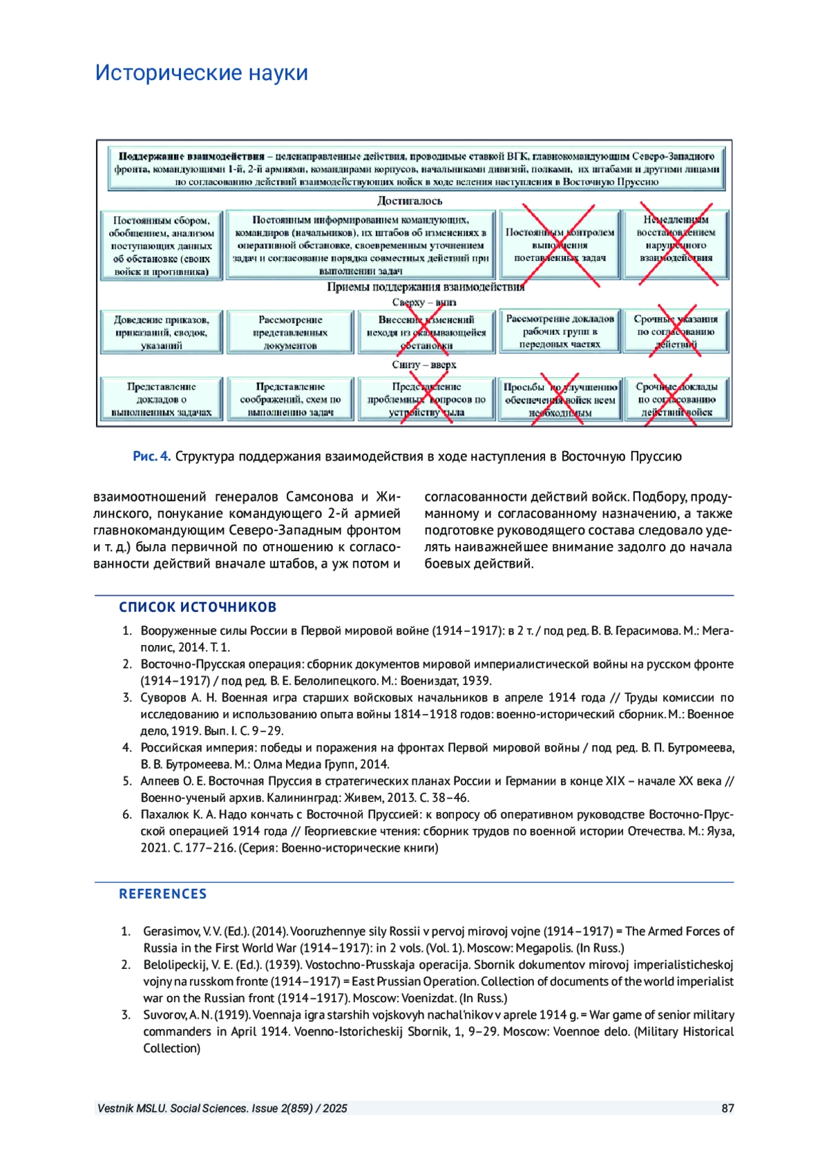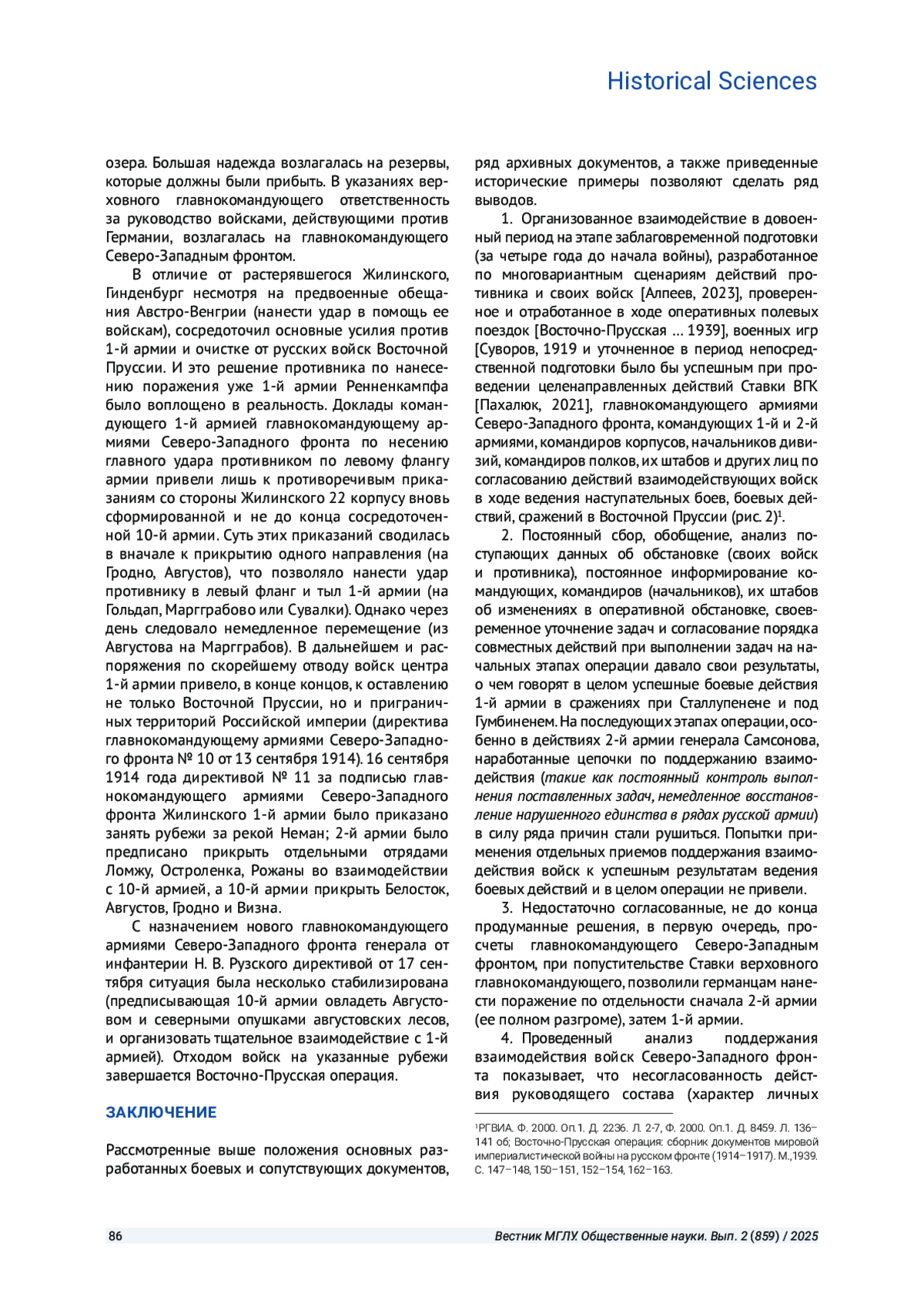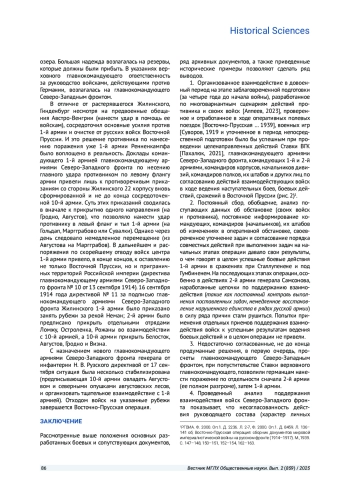 Цель исследования - дать характеристику деятельности руководства Северо-Западным фронтом 1-й и 2-й Армий, входящих в его состав. Корпусам дивизий этих армий была доверена координация войск в ходе ведения Восточно-Прусской операции. В статье применяются историко-системный и историко-типологический методы исследования. Они отвечают современным требованиям к историческим исследованиям. Использование этих методов позволило провести исследование достаточно большого количества исторических документов Ставки Верховного главнокомандующего, Северо-Западного фронта, штабов 1-й и 2-й армий и некоторых корпусов дивизий, входящих в их состав. Приводятся примеры согласования усилий между различными органами управления, армиями, корпусами и дивизиями в ходе ведения боевых действий последовательно по дням операции и направлениям действий войск. Отмечаются сложности в поддержании взаимодействия войск на различных этапах проведения боевых операций. Сложности возникают при выдвижении к государственной границе, завязке боя, ведении боевых действий, выходе из боя, выходе из окружения, отходе на другие рубежи, переходе к ведению оборонительных действий. Рассматриваются документы, позволяющие определить порядок действий командующих (командиров, начальников), их штабов на всех этапах ведения боевых операций. На основании рассмотренных исторических и аналитических документов делаются выводы о содержании, последовательности достижения устойчивого взаимодействия войск, об их составных частях и приемах по согласованию усилий различных родов войск на всех этапах ведения Восточно-Прусской операции, а при необходимости и восстановления взаимодействия; определяются причины нарушений в ходе ведения операции. Кроме того, делаются выводы о влиянии и роли организованного взаимодействия до начала операции на его поддержание и восстановление в ходе ведения.