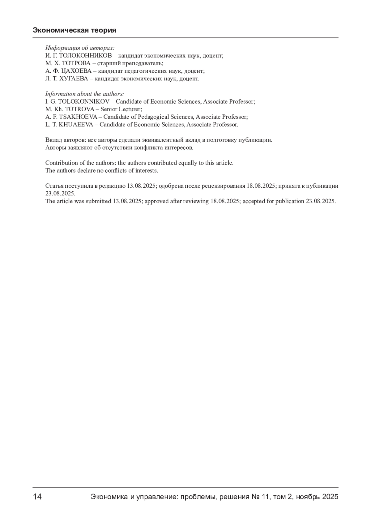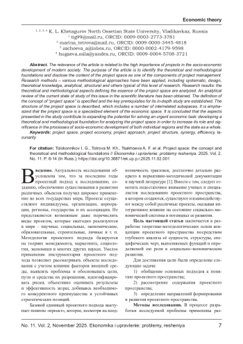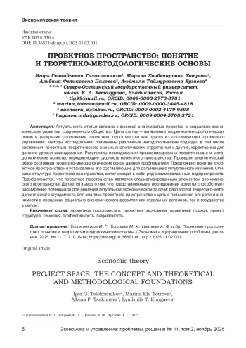 ТОЛОКОННИКОВ И. Г., ТОТРОВА М. Х., ЦАХОЕВА А. Ф., ХУГАЕВА Л. Т. ПРОЕКТНОЕ ПРОСТРАНСТВО: ПОНЯТИЕ И ТЕОРЕТИКО-МЕТОДОЛОГИЧЕСКИЕ ОСНОВЫ // ЭКОНОМИКА И УПРАВЛЕНИЕ: ПРОБЛЕМЫ, РЕШЕНИЯ. 2025. ТОМ 2 № 11