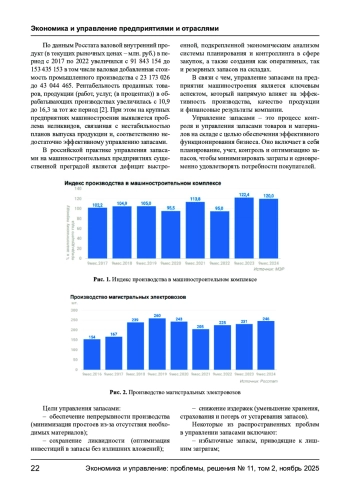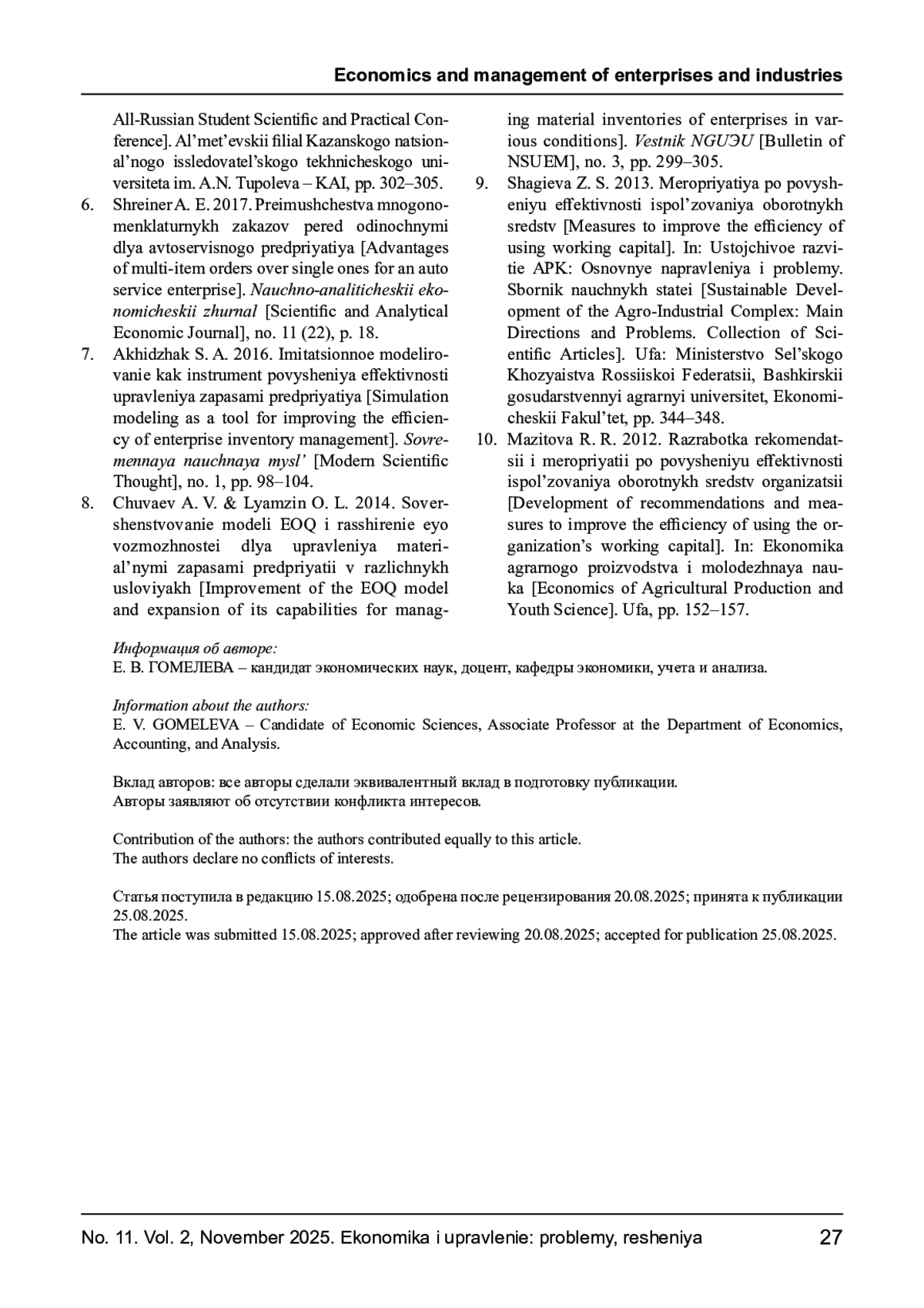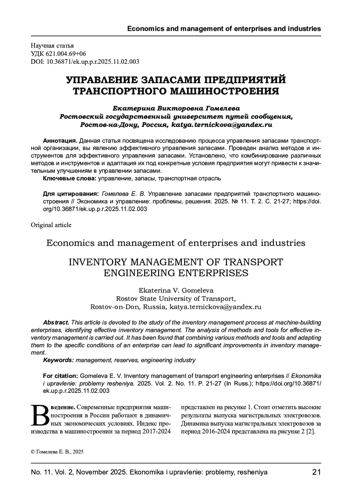 ГОМЕЛЕВА Е. В. УПРАВЛЕНИЕ ЗАПАСАМИ ПРЕДПРИЯТИЙ ТРАНСПОРТНОГО МАШИНОСТРОЕНИЯ // ЭКОНОМИКА И УПРАВЛЕНИЕ: ПРОБЛЕМЫ, РЕШЕНИЯ. 2025. ТОМ 2 № 11
