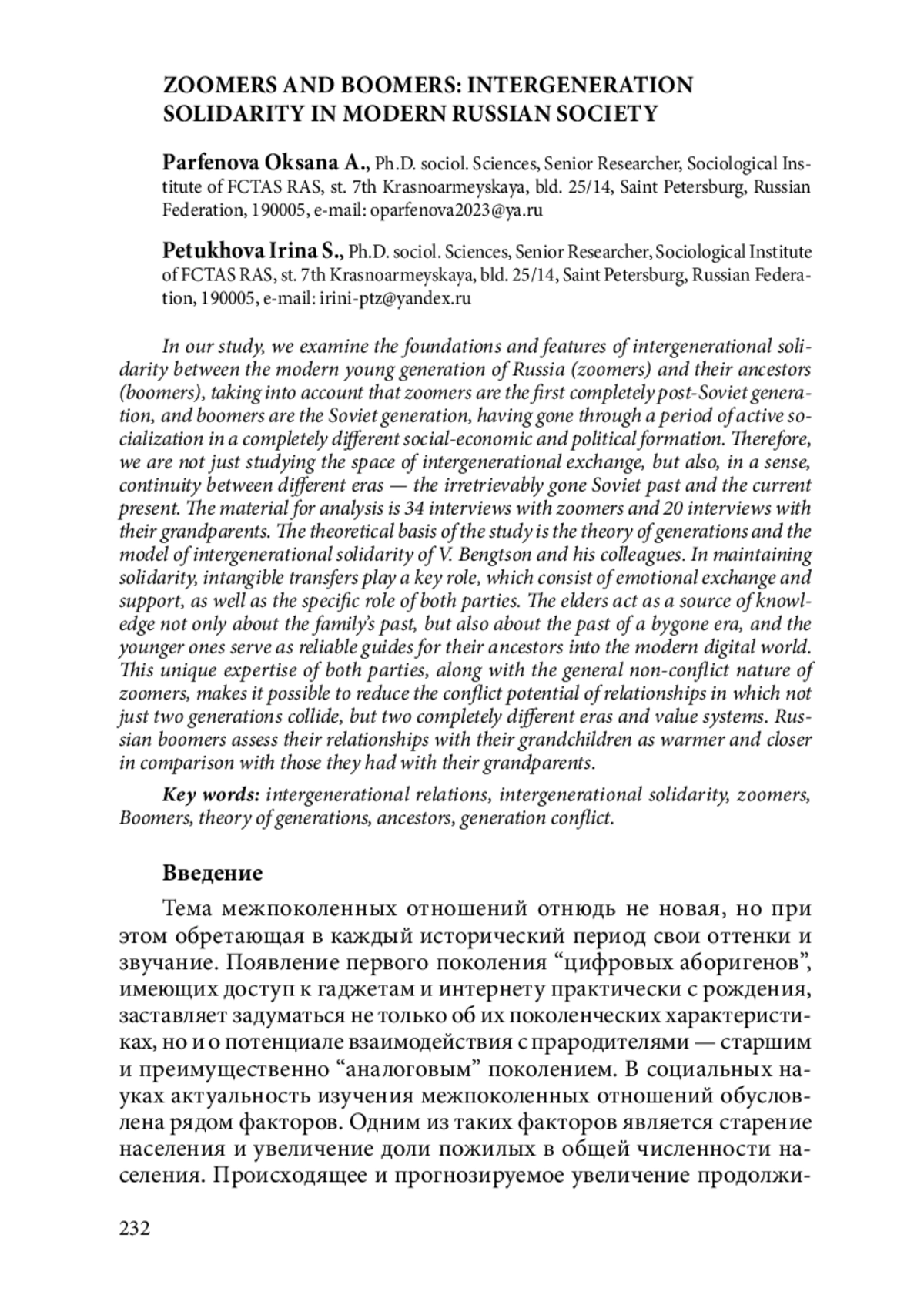 ПАРФЕНОВА О. А., ИРИНА С. П. ЗУМЕРЫ И БУМЕРЫ: МЕЖПОКОЛЕННАЯ СОЛИДАРНОСТЬ В СОВРЕМЕННОМ РОССИЙСКОМ ОБЩЕСТВЕ // ВЕСТНИК МОСКОВСКОГО УНИВЕРСИТЕТА. СЕРИЯ 18. СОЦИОЛОГИЯ И ПОЛИТОЛОГИЯ. 2024. ТОМ 30 № 3
