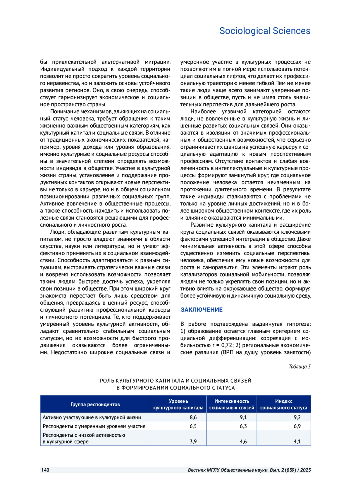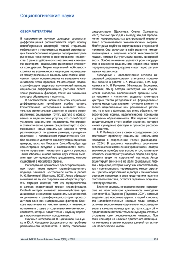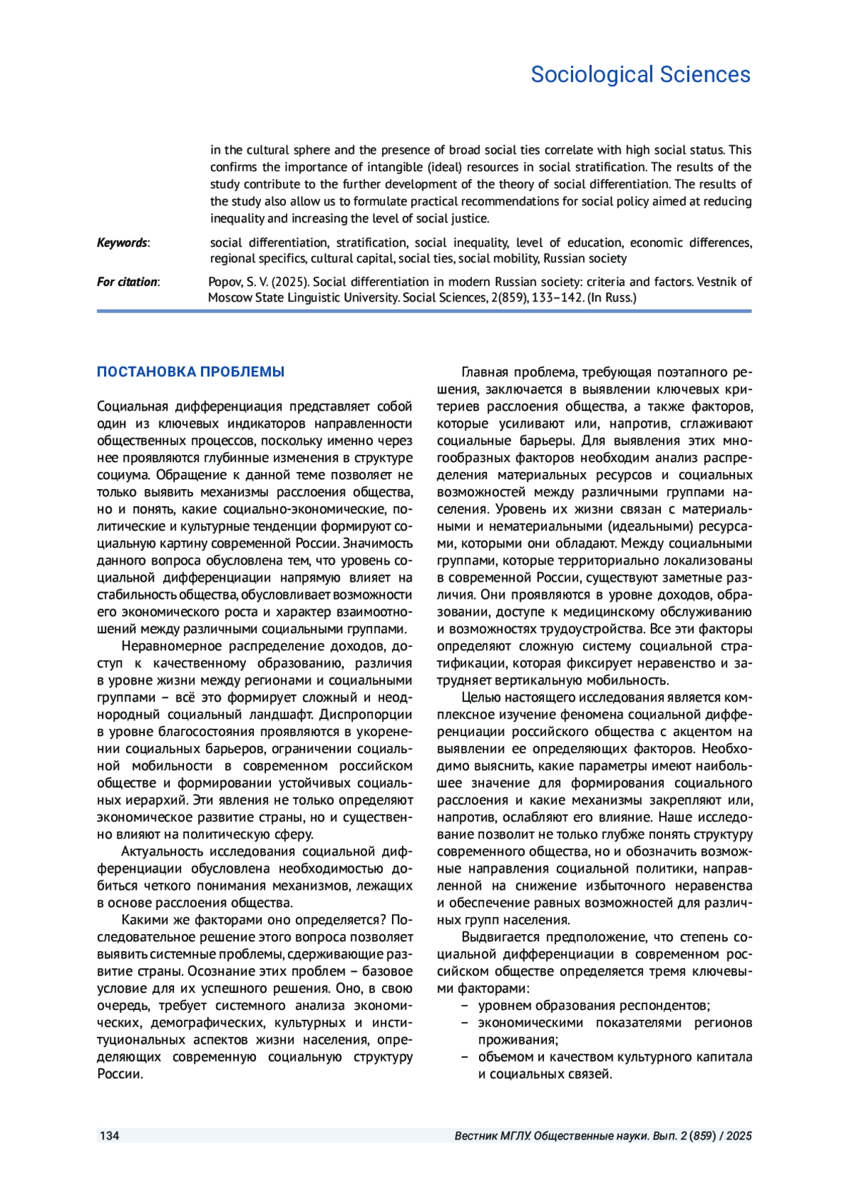 В статье рассматриваются ключевые критерии и факторы, определяющие социальную дифференциацию в современном российском обществе. Исследование опирается на три взаимосвязанных направления: влияние уровня образования на социальное положение различных групп населения, воздействие региональных экономических различий на стратификационные процессы и роль культурного капитала в формировании социального статуса представителей российского общества. На основе эмпирических данных выявлено, что образование остается одним из главных инструментов социальной мобильности, однако его эффективность зависит от экономического контекста региона. Различия в валовом региональном продукте, уровне занятости и доходах обусловливают степень социальной стабильности и степень расслоения населения. Кроме того, активная вовлеченность в культурную сферу и наличие широких социальных связей коррелирует с высоким социальным статусом. Тем самым подтверждается значимость нематериальных (идеальных) ресурсов в социальной стратификации. Результаты исследования способствуют дальнейшему развитию теории социальной дифференциации. Итоги исследования позволяют также сформулировать практические рекомендации для социальной политики, направленной на снижение неравенства и повышение уровня социальной справедливости.